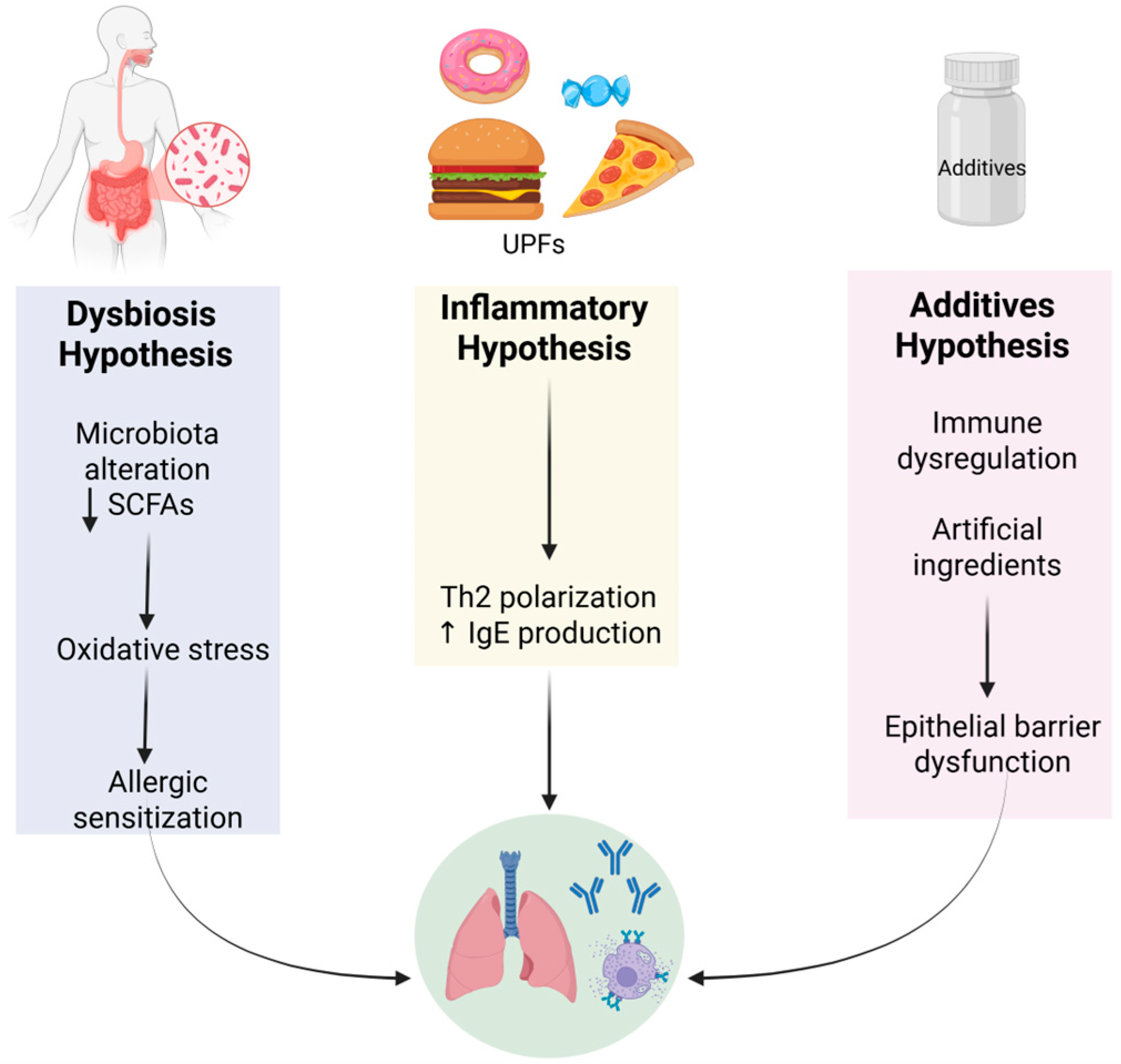 Figure 1. Mechanistic hypotheses linking UPFs to respiratory disease: dysbiosis, inflammation, and immune dysregulation from additives. Created in https://BioRender.com.