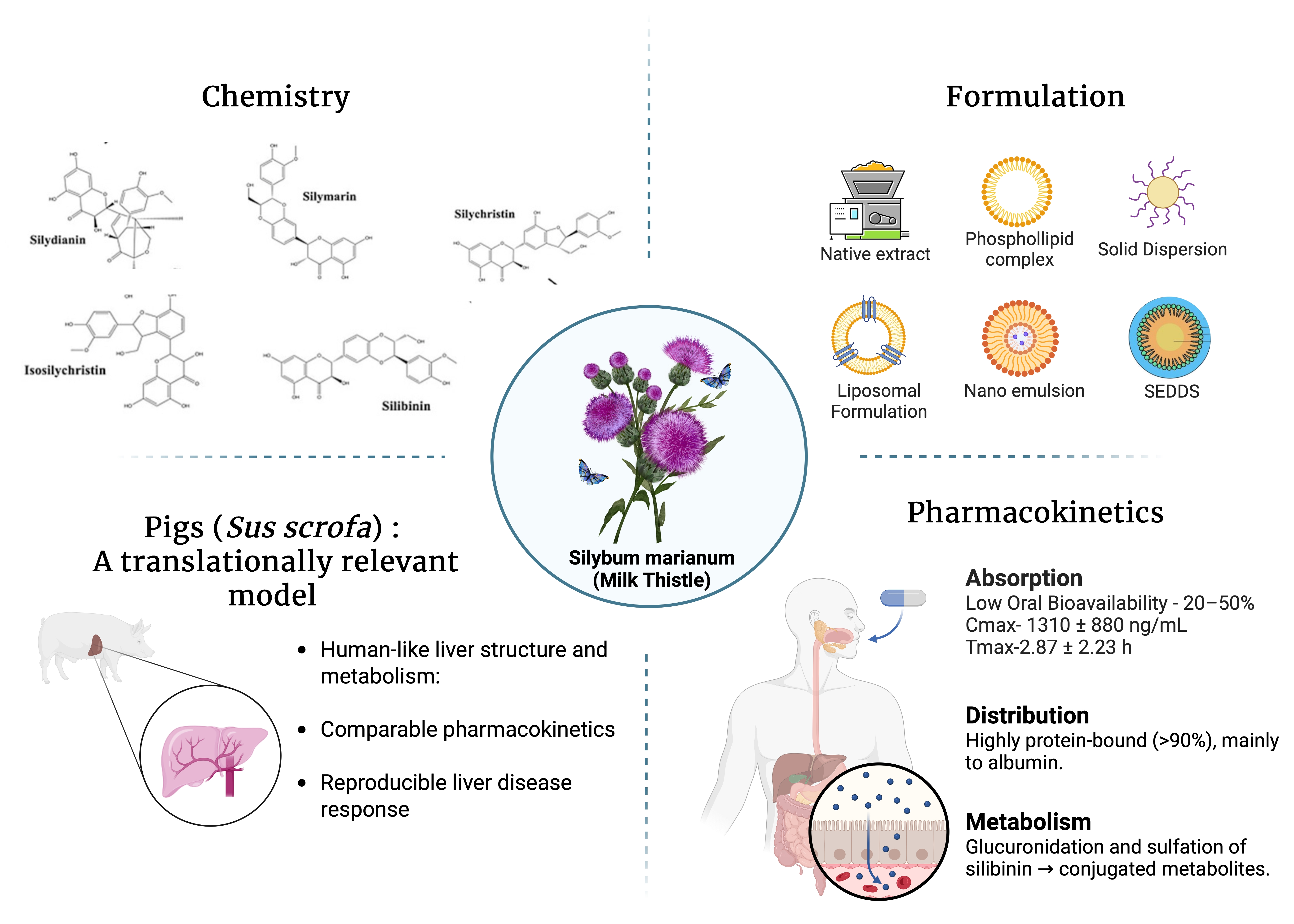 Table 1). These anatomical and biochemical congruencies underpin the translational fidelity of pigs in evaluating silymarin’s pharmacodynamics, bioavailability, and tissue-specific metabolic responses [