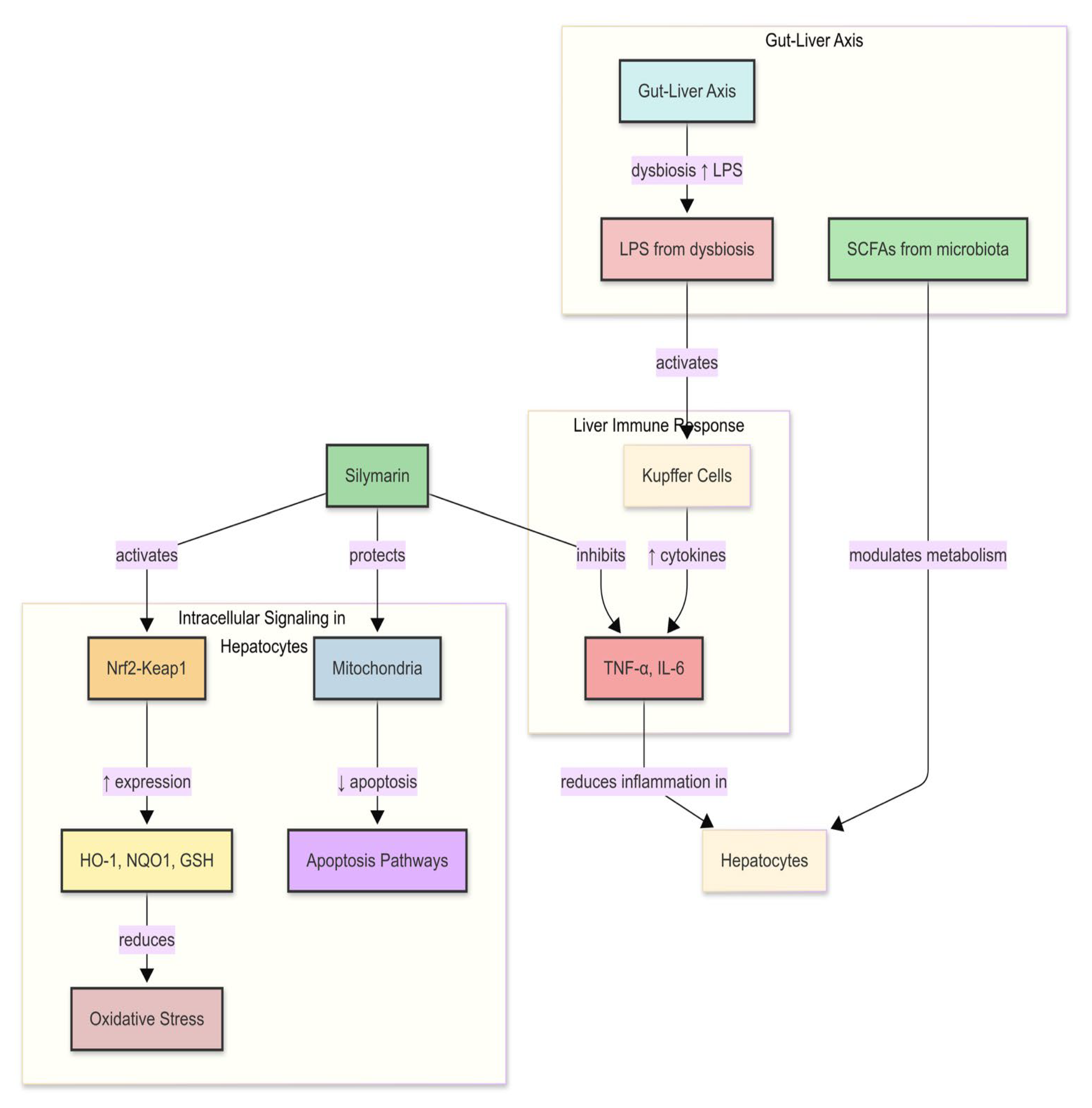 Crosstalk between antioxidant and inflammatory pathways modulated by silymarin in hepatocytes. This schematic delineates the multifaceted protective mechanisms of silymarin in preserving hepatic homeostasis. Within hepatocytes, silymarin initiates the activation of the Nrf2–Keap1 signaling pathway, resulting in the upregulation (↑) of genes associated with antioxidant defense, including HO-1, NQO1, and GSH, thus alleviating oxidative stress. Simultaneously, it safeguards mitochondrial integrity, thereby diminishing apoptosis. In the context of the hepatic immune microenvironment, silymarin hinders the activation of Kupffer cells and downregulates (↓) proinflammatory cytokines (TNF-α, IL-6), which collectively serve to mitigate liver inflammation. At the systemic level, via the gut–liver axis, dysbiosis of the gut microbiota elevates levels of lipopolysaccharides (LPSs), which incite hepatic immune responses, whereas short-chain fatty acids (SCFAs) produced by a healthy microbiota contribute to metabolic equilibrium. Silymarin indirectly antagonizes LPS-induced inflammation and modulates metabolic homeostasis through gut–liver interactions. Collectively, these actions exemplify the dual regulatory capacity of silymarin in cellular redox defense and immunometabolic equilibrium, thereby underscoring its therapeutic promise in the management of chronic liver disease.