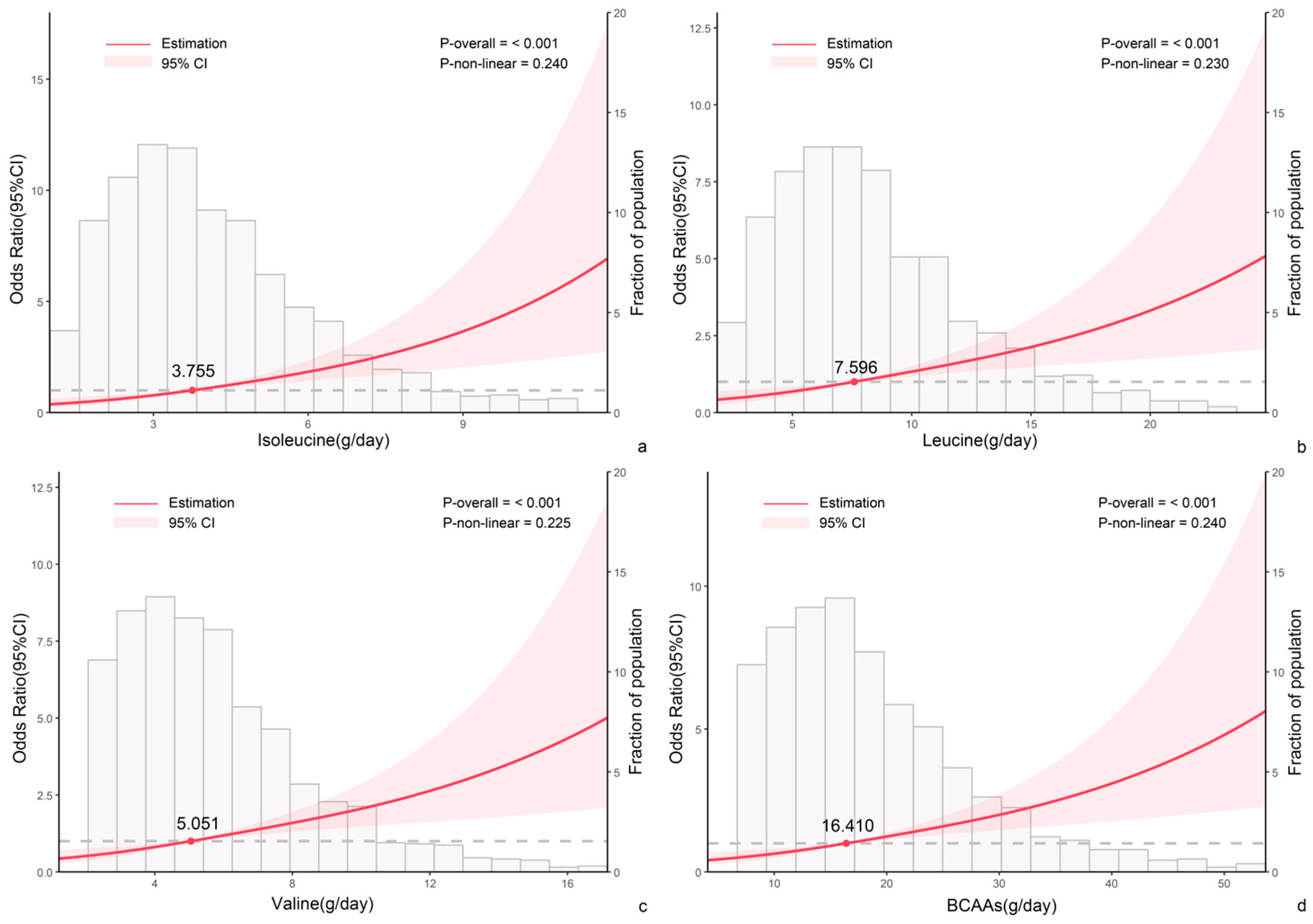 BCAAs | 1.02 | (1.01, 1.04) | 0.009 | 1.02 | (1.01, 1.04) | 0.009 | 1.06 | (1.03, 1.09) | <0.001 |