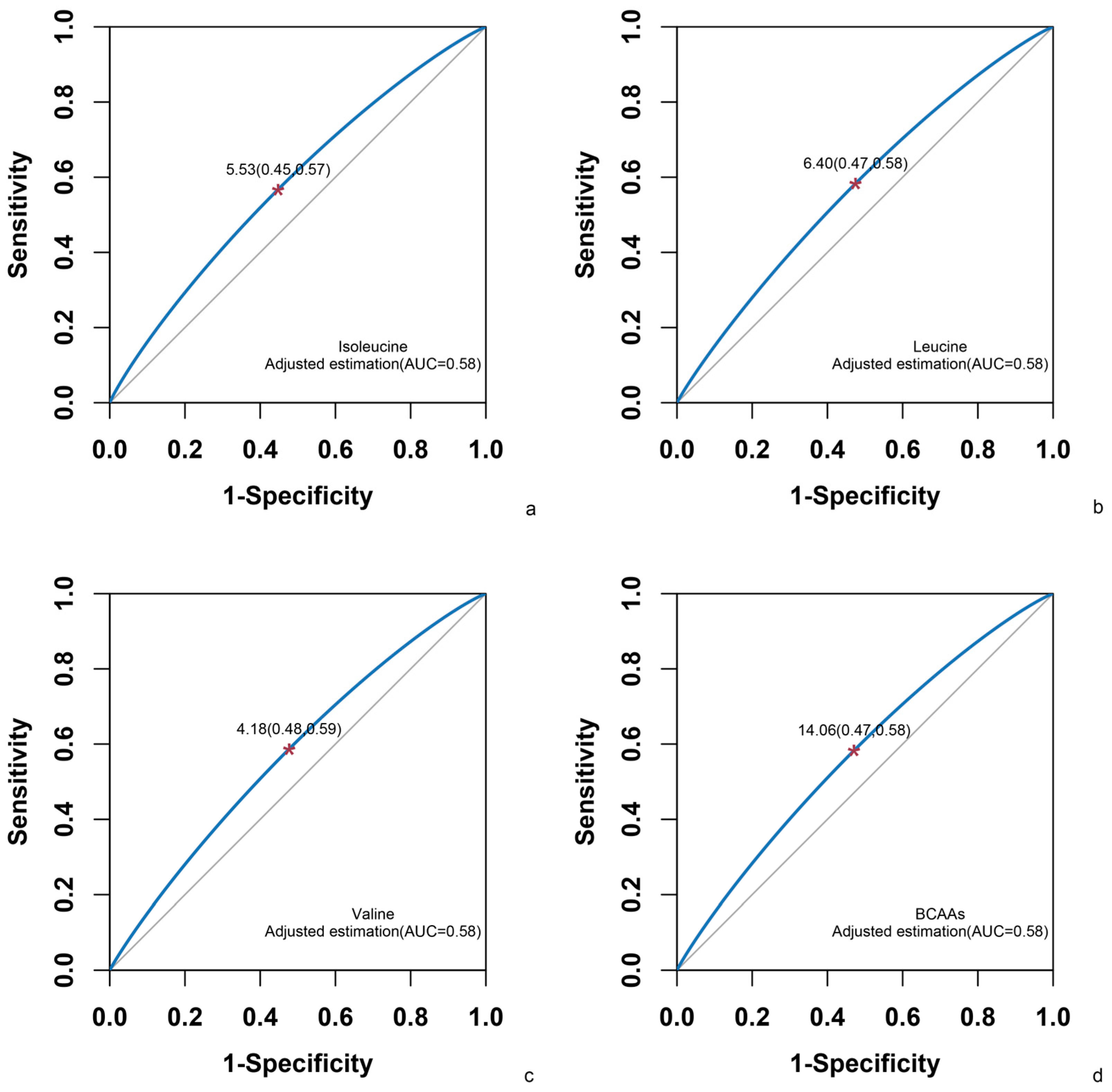 Leucine | 1.04 | (1.01, 1.08) | 0.010 | 1.04 | (1.01, 1.08) | 0.010 | 1.13 | (1.06, 1.20) | <0.001 |