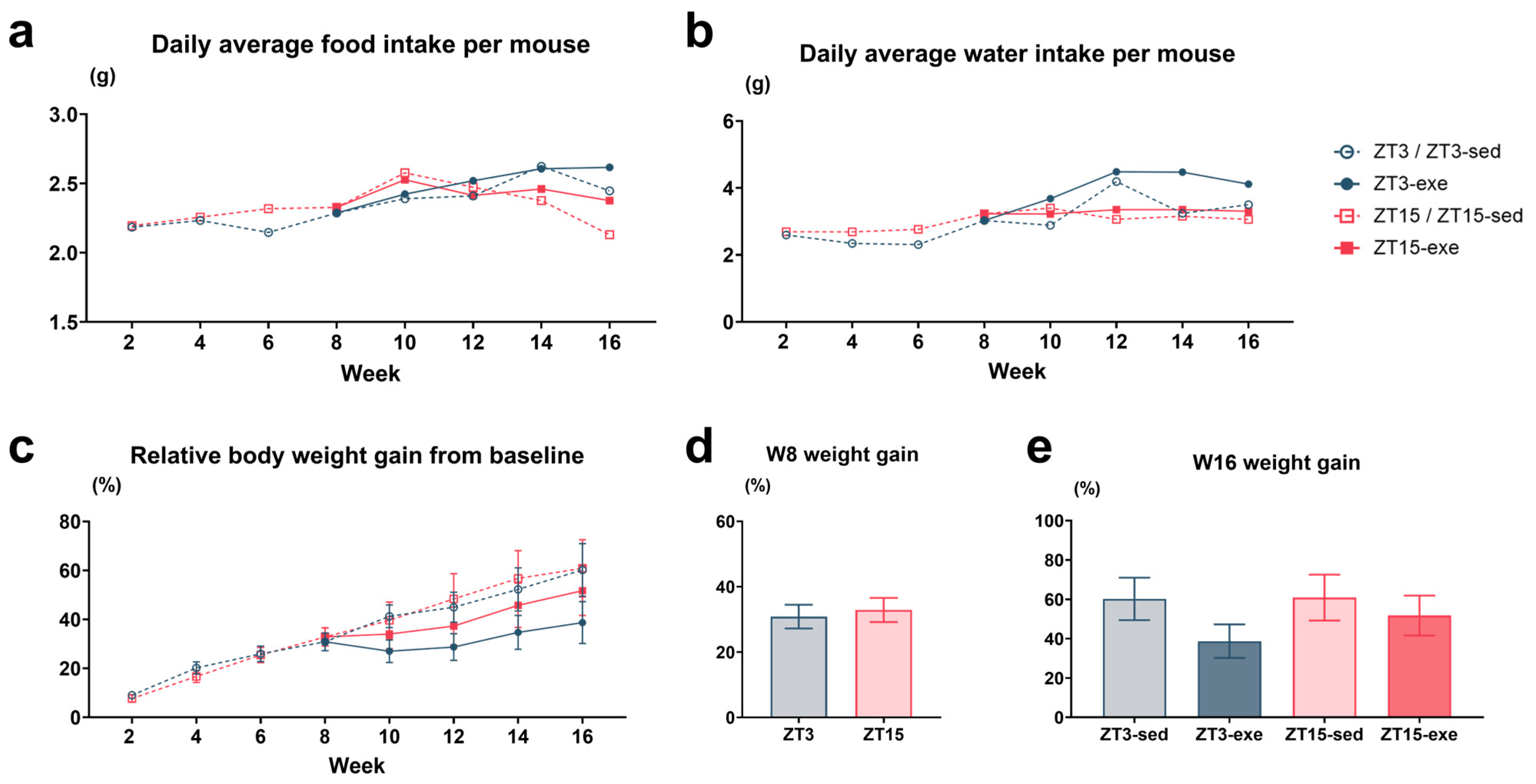3.1.2. Food and Water Intake and Body Weight Gain During HFD and Exercise Intervention