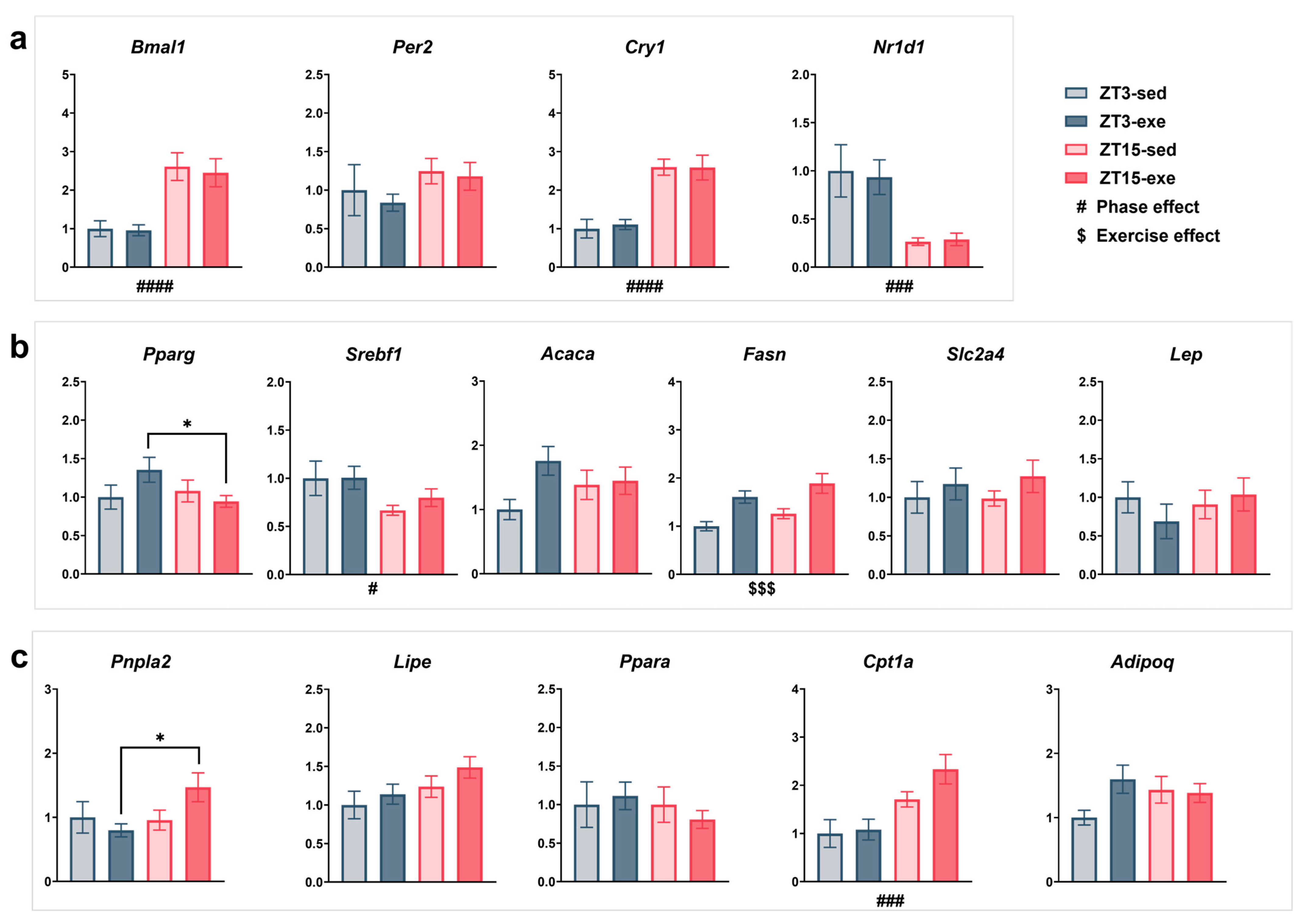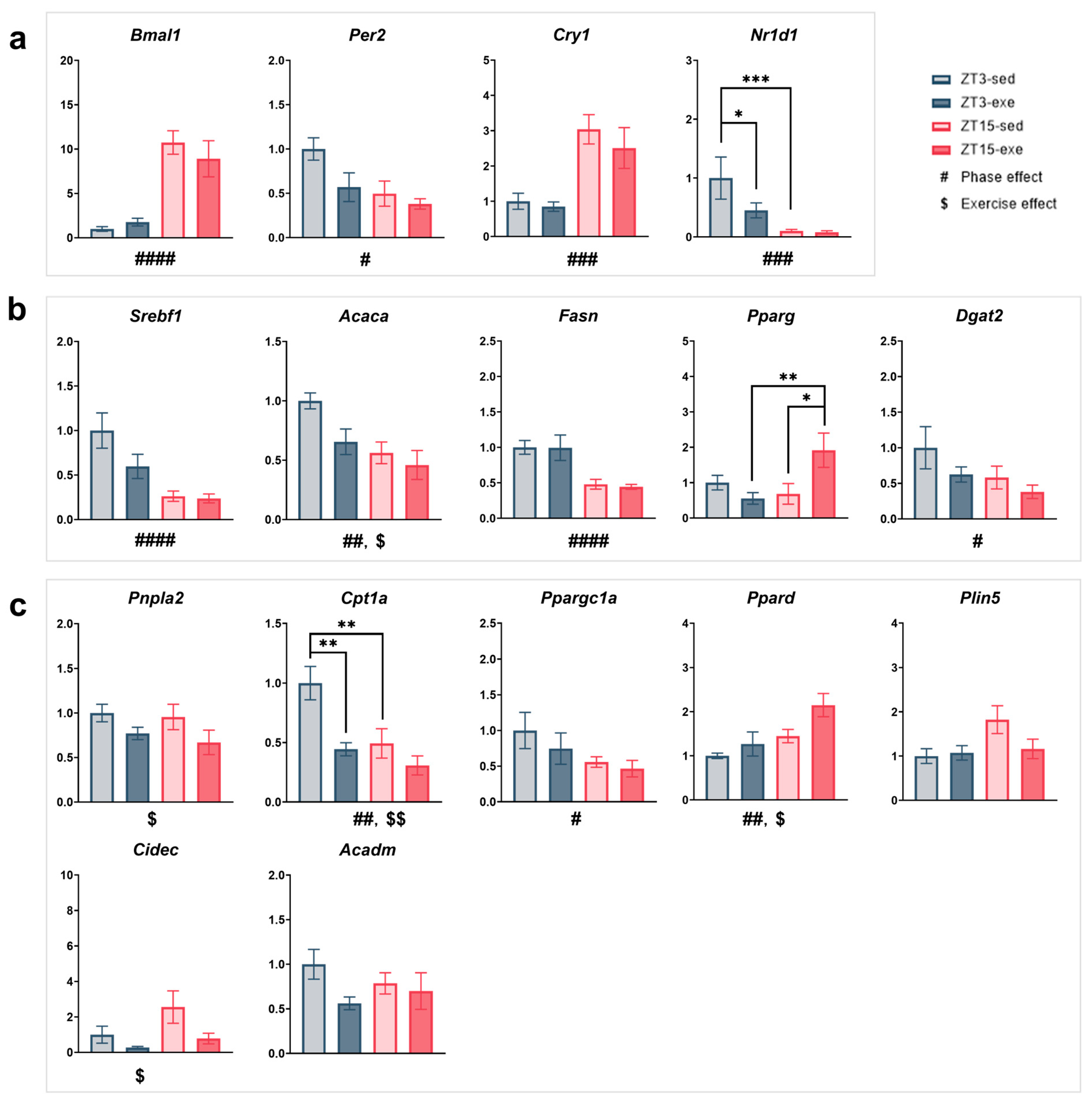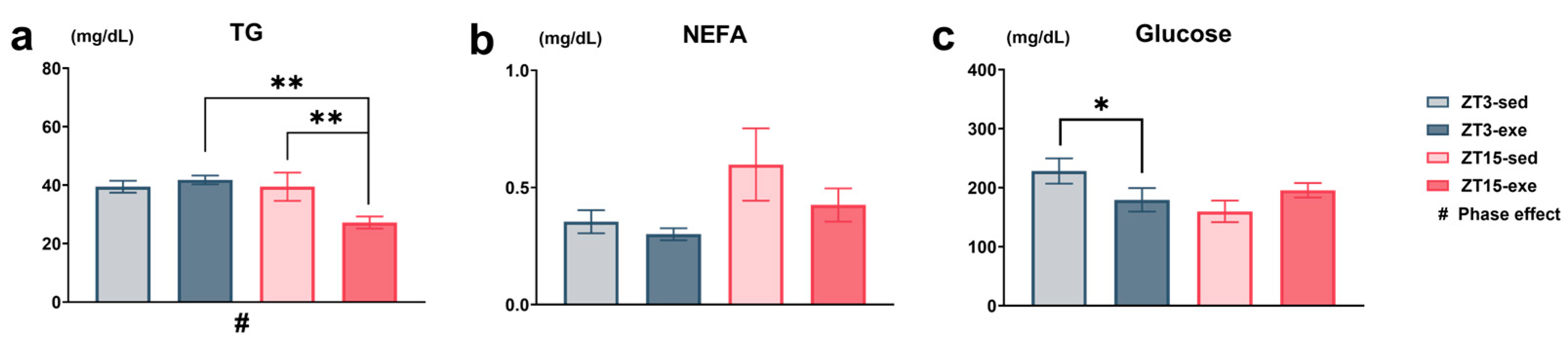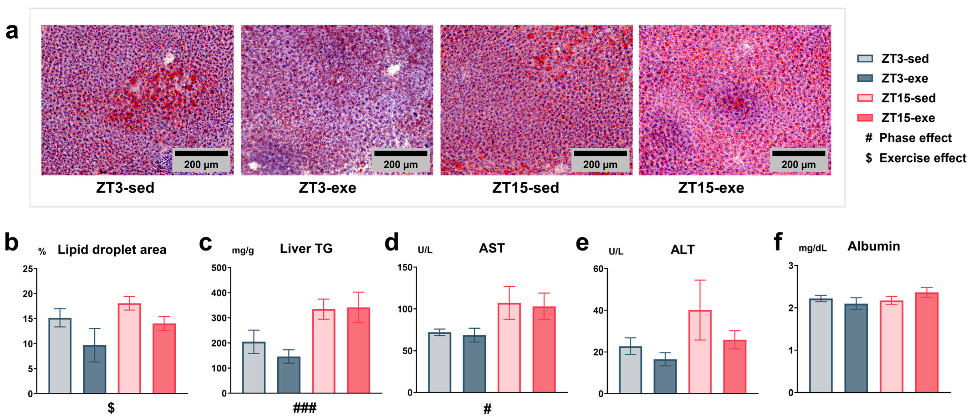 3.3. Effects of Exercise and Circadian Phase on Hepatic Lipid Accumulation and Plasma Biochemical Parameters
