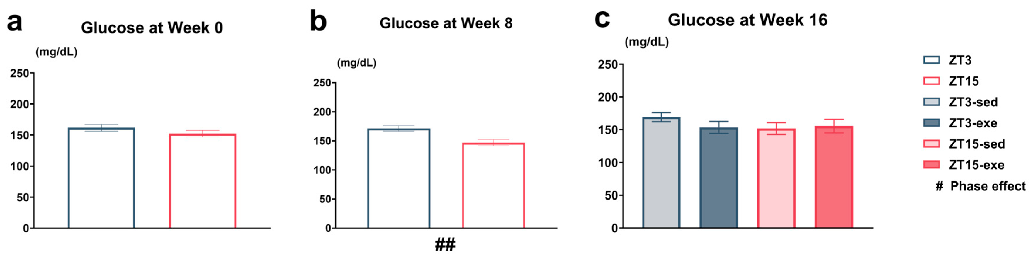 - Pendergrast, L.A.; Ashcroft, S.P.; Ehrlich, A.M.; Treebak, J.T.; Krook, A.; Dollet, L.; Zierath, J.R. Metabolic Plasticity and Obesity-Associated Changes in Diurnal Postexercise Metabolism in Mice. Metabolism 2024, 155, 155834. [Google Scholar] [CrossRef]