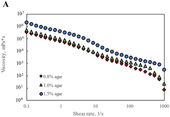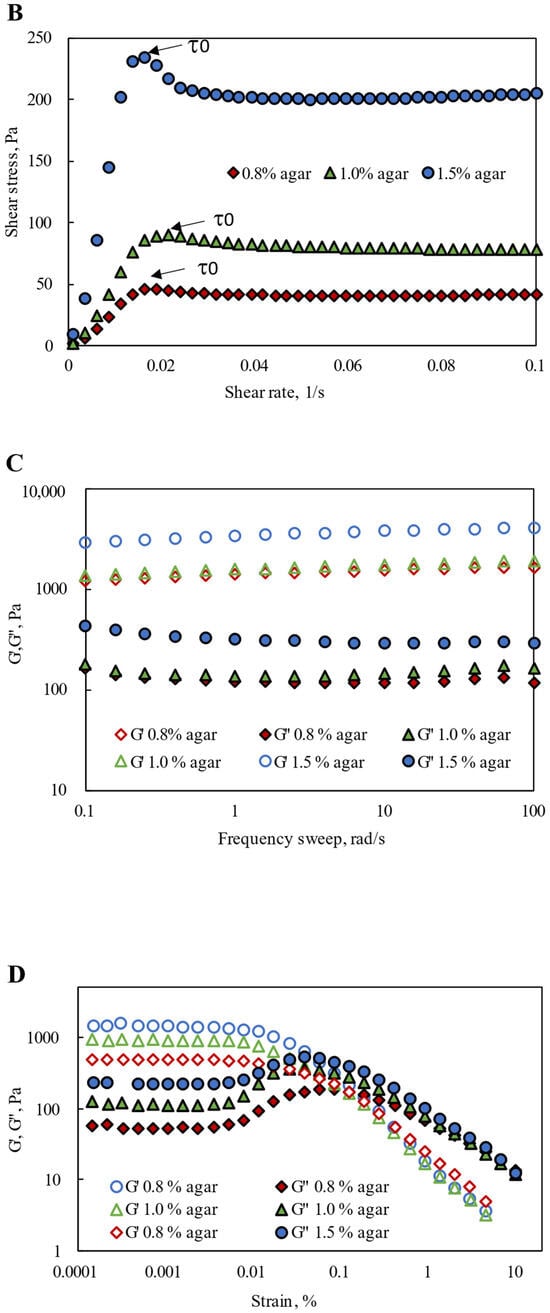 Since Agar-CMC hydrogels have been found to exhibit textural properties that may facilitate easier and safer swallowing, their rheological performance during swallowing is extremely important. Shear sweep tests were conducted to gather evidence of the apparent shear flow behavior and shear yield stress of the hydrogels. All hydrogels displayed strong shear-thinning behavior, with viscosity decreasing as shear rate increased in the higher range of shear rates (0.01–100 s−1) (Figure 1A). This behavior is driven by the high molecular weight and polymeric structure of agar and carboxymethylcellulose—the polymer chains align in the flow direction, reducing internal resistance and viscosity [29]. An increase in apparent viscosity η50 was observed with rising agar concentration from 0.8% to 1.5%. Table 1 shows that Agar-CMC hydrogels with 1.0% and 1.5% agar exhibited a thickness level 4 according to the η50 range of NDD levels for thickening liquids (η50 > 1750 mPa s, pudding-like). This suggests they are suitable for people with severe dysphagia, considering that η50 corresponds to the shear rate in the oral cavity during swallowing.