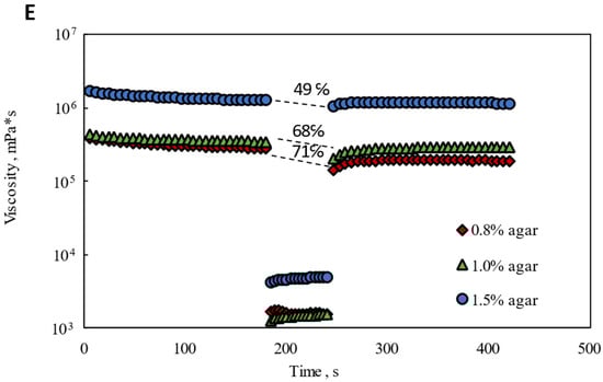 Finally, a three-step “low–high–low” test was performed to assess whether the Agar-CMC hydrogels tended to recover quickly after shearing during a simulated oral shearing process at a shear rate of 50 s−1 (Figure 1E). When the gels were exposed to a low, constant shear rate of 0.01 s−1 for 3 min, their viscosity slightly decreased. When subjected to a high, constant shear rate of 50 s−1, the viscosity suddenly dropped significantly and remained steady during this phase. Later, when the shear rate was reduced to 0.01 s−1 and maintained for 3 min, the viscosity of all hydrogels gradually recovered, though none returned to the initial viscosity. The shear recovery tests of Agar-CMC hydrogels showed a decreasing recovery factor in peak viscosity (from 75% to 49%) as agar concentration increased from 0.8% to 1.5%. It can be understood that higher agar concentration led to weaker interactions between gelling agent molecules. These weaker interactions contributed to solid-like behavior under lower yield stress and fluid behavior when these interactions were disrupted at higher yield stress. According to Zhang et al. [33], agarose hydrogels with higher concentration also had better recovery properties.