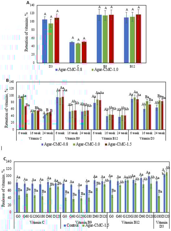 (A) Retention of added vitamins after processing. Upper case letters indicate significant (p < 0.05) differences in Agar-CMC hydrogels with different agar concentration; (B) Retention of added vitamins after six weeks of storage of Agar-CMC hydrogels at 4 °C. Lower case letters indicate significant (p < 0.05) differences in stability between different Agar-CMC hydrogels and upper case letters indicate significant (p < 0.05) differences in Agar-CMC hydrogels stability during storage; (C) Release kinetics of vitamins during in vitro digestion of Agar-CMC hydrogels. Lower case letters indicate significant (p < 0.05) differences in vitamin release at different stages of in vitro digestion and upper case letters indicate significant (p < 0.05) differences in vitamin release between control and Agar-CMC hydrogel.