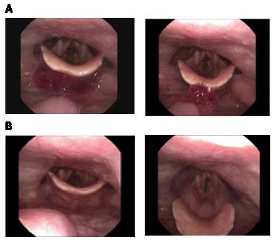 Fiberoptic Endoscopic Evaluation of Swallowing photos of Agar-CMC-1.5 hydrogel. (A) during the initiation of swallowing: there are no “white out” and the content is visible in the valleculae and on the epiglottis; (B) after swallowing: no residue in the valleculae and in the pyriform sinus (1 point in the Yale Pharyngeal Residue Severity Rating Scale, YPRSRS).