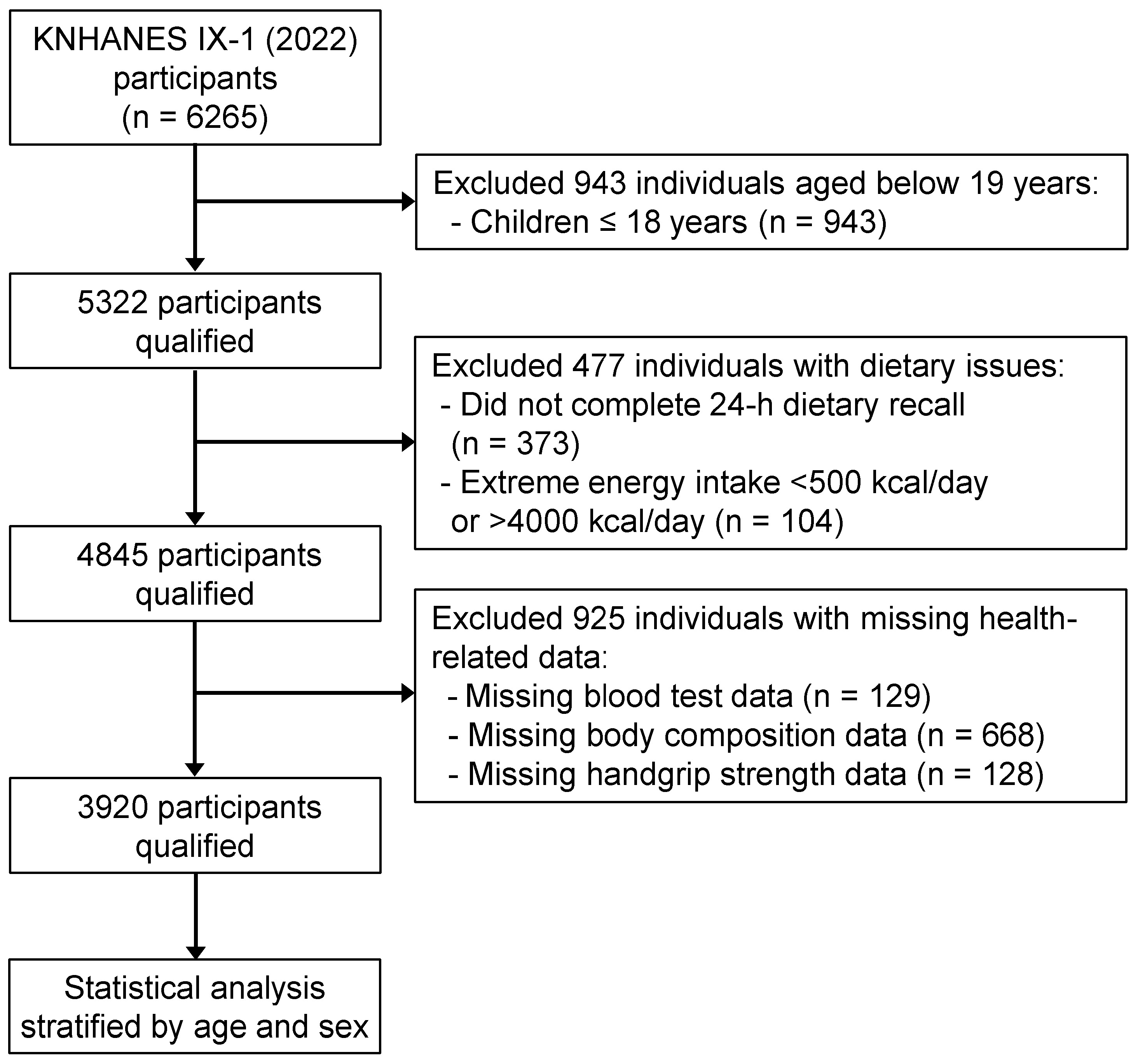 - Oh, K.; Kim, Y.; Kweon, S.; Kim, S.; Yun, S.; Park, S.; Lee, Y.-K.; Kim, Y.-T.; Park, O.; Jeong, E.K. Korea national health and nutrition examination survey, 20th anniversary: Accomplishments and future directions. Epidemiol. Health 2021, 43, e2021025. [Google Scholar] [CrossRef] [PubMed] [PubMed Central]