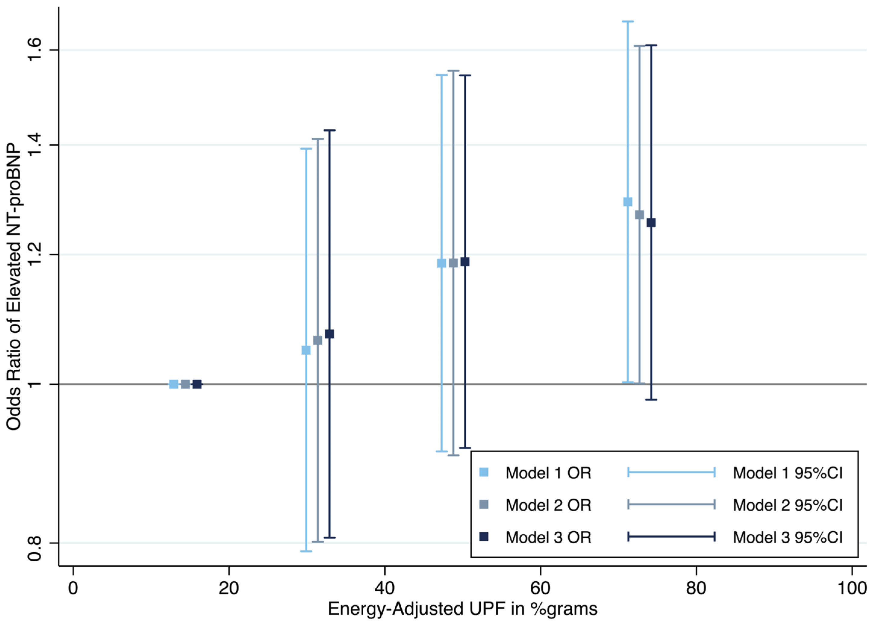 3.3. Ultra-Processed Food Intake and Cardiac Biomarkers