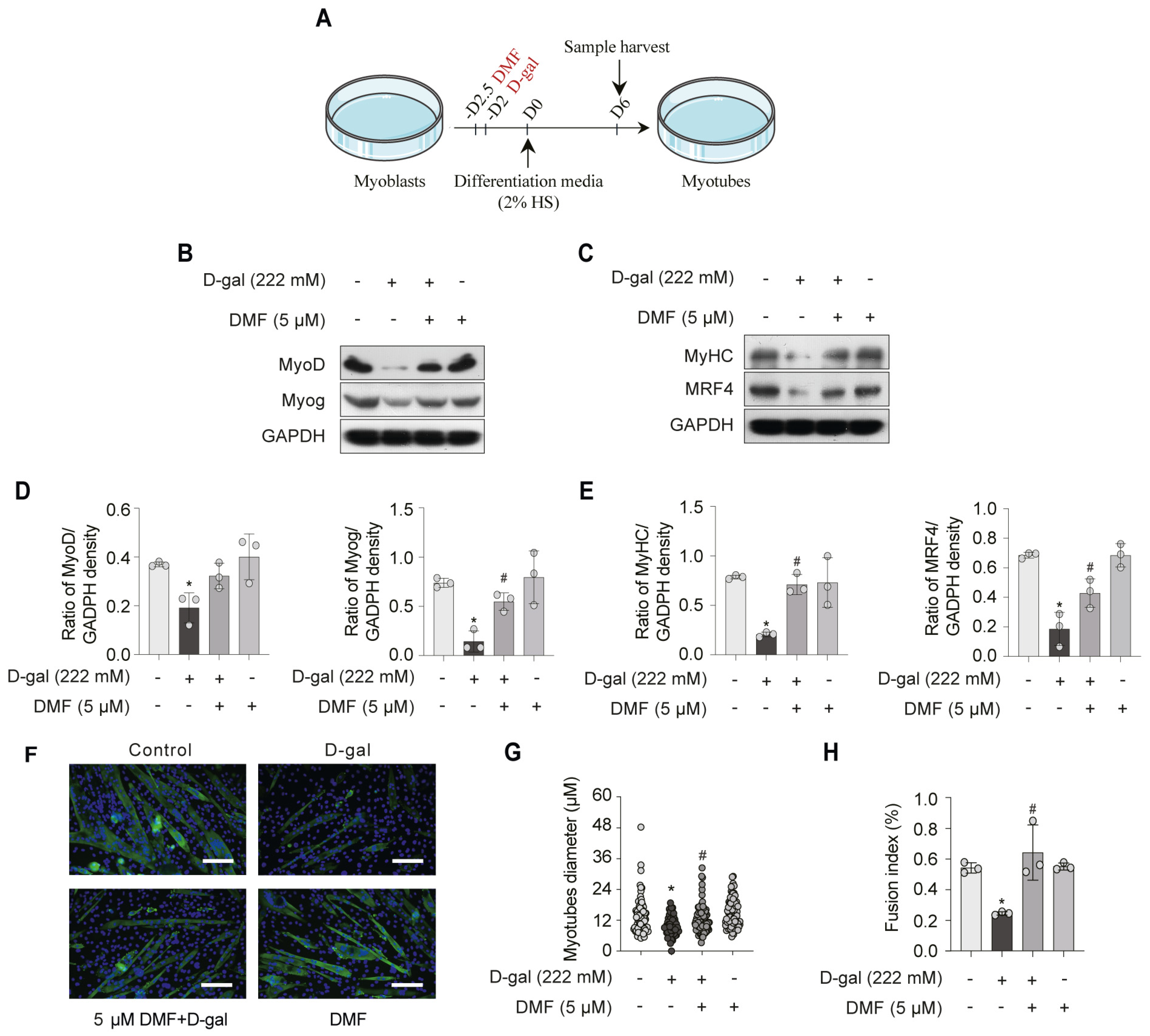 3.2. DMF Promotes Myogenesis by Alleviating D-Gal-Induced Senescence in Myoblasts