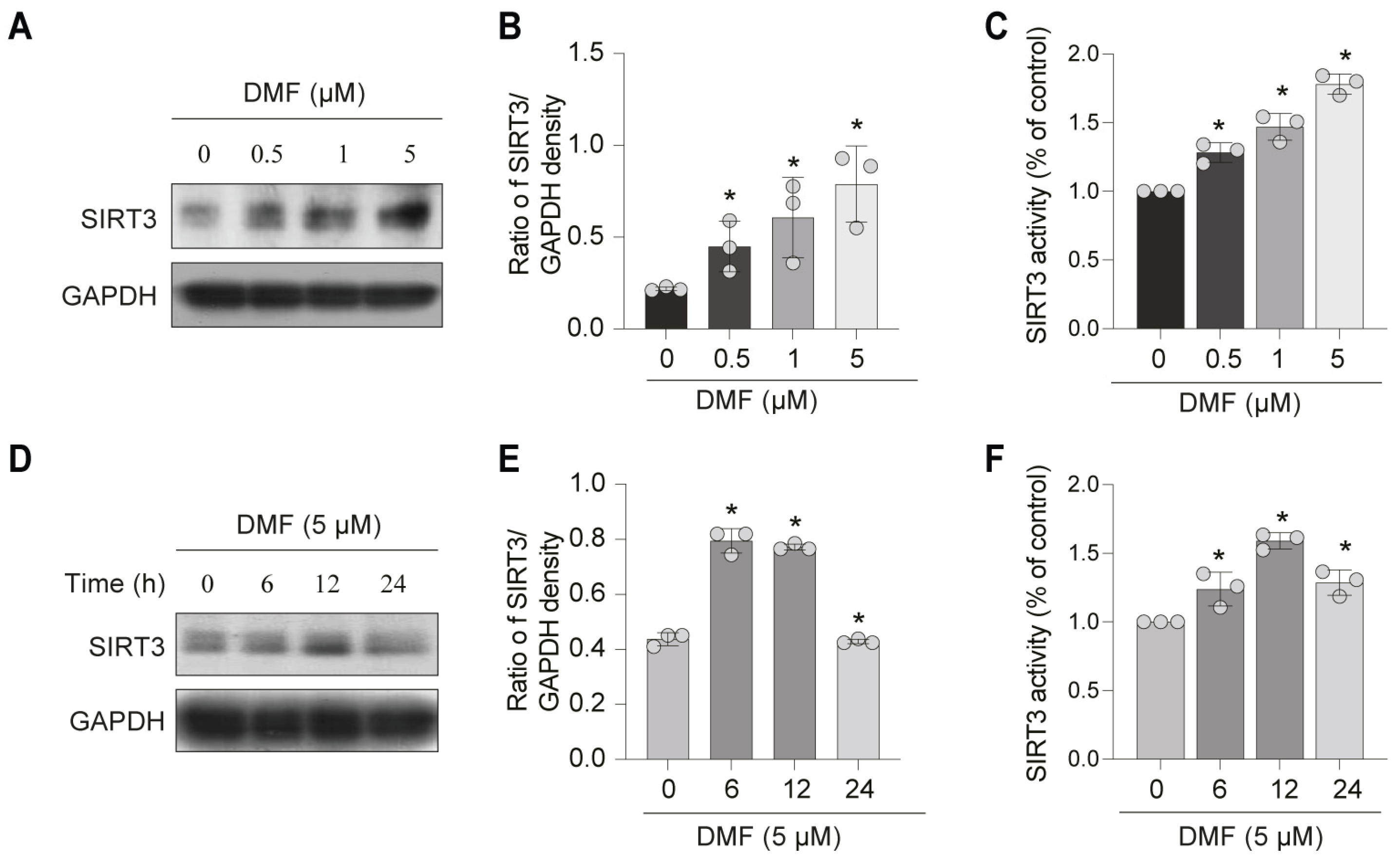 3.3. DMF, a SIRT3 Activator, Enhances SOD2 Activity and Inhibits Mitochondrial ROS (mtROS) in C2C12 Myoblasts