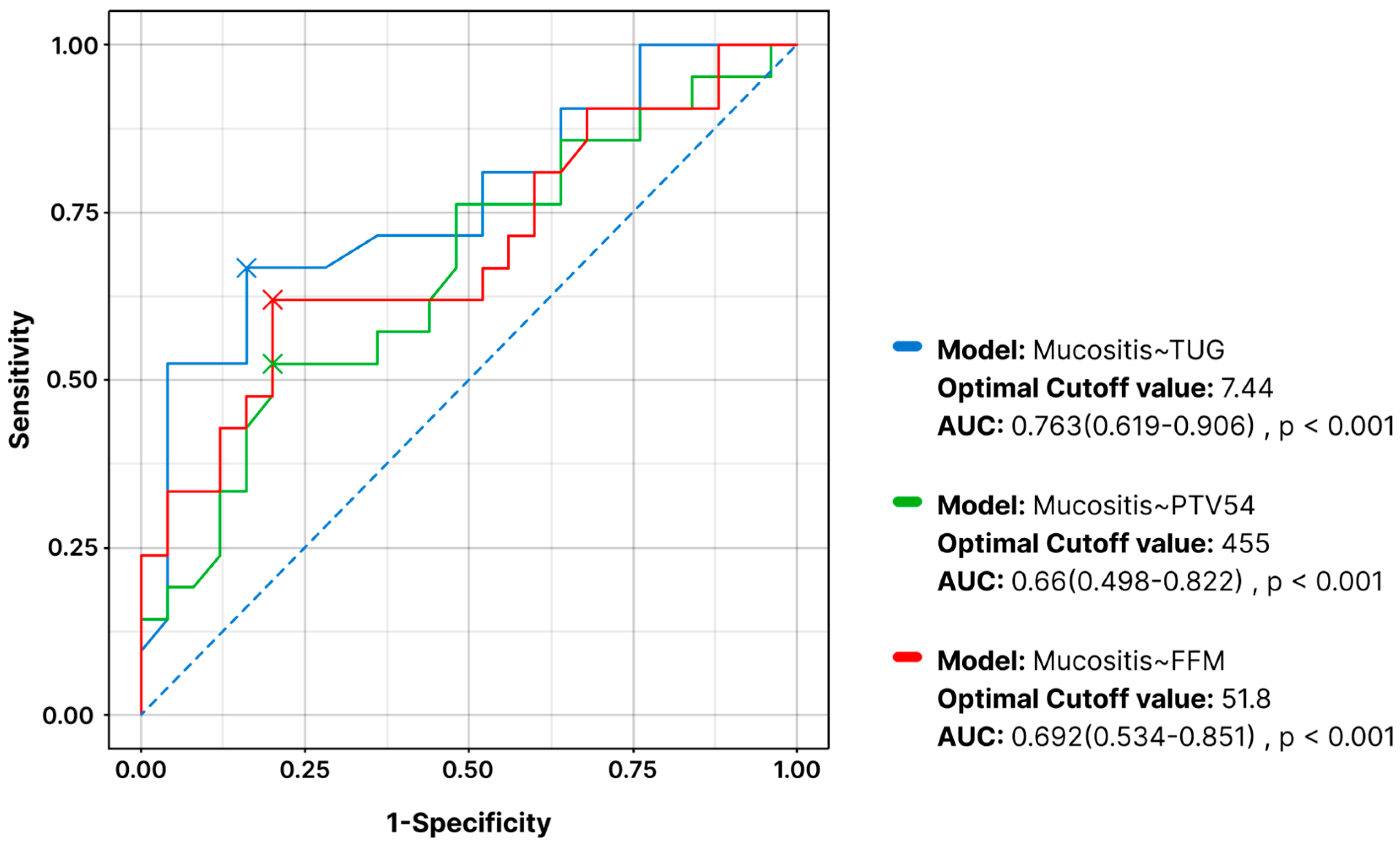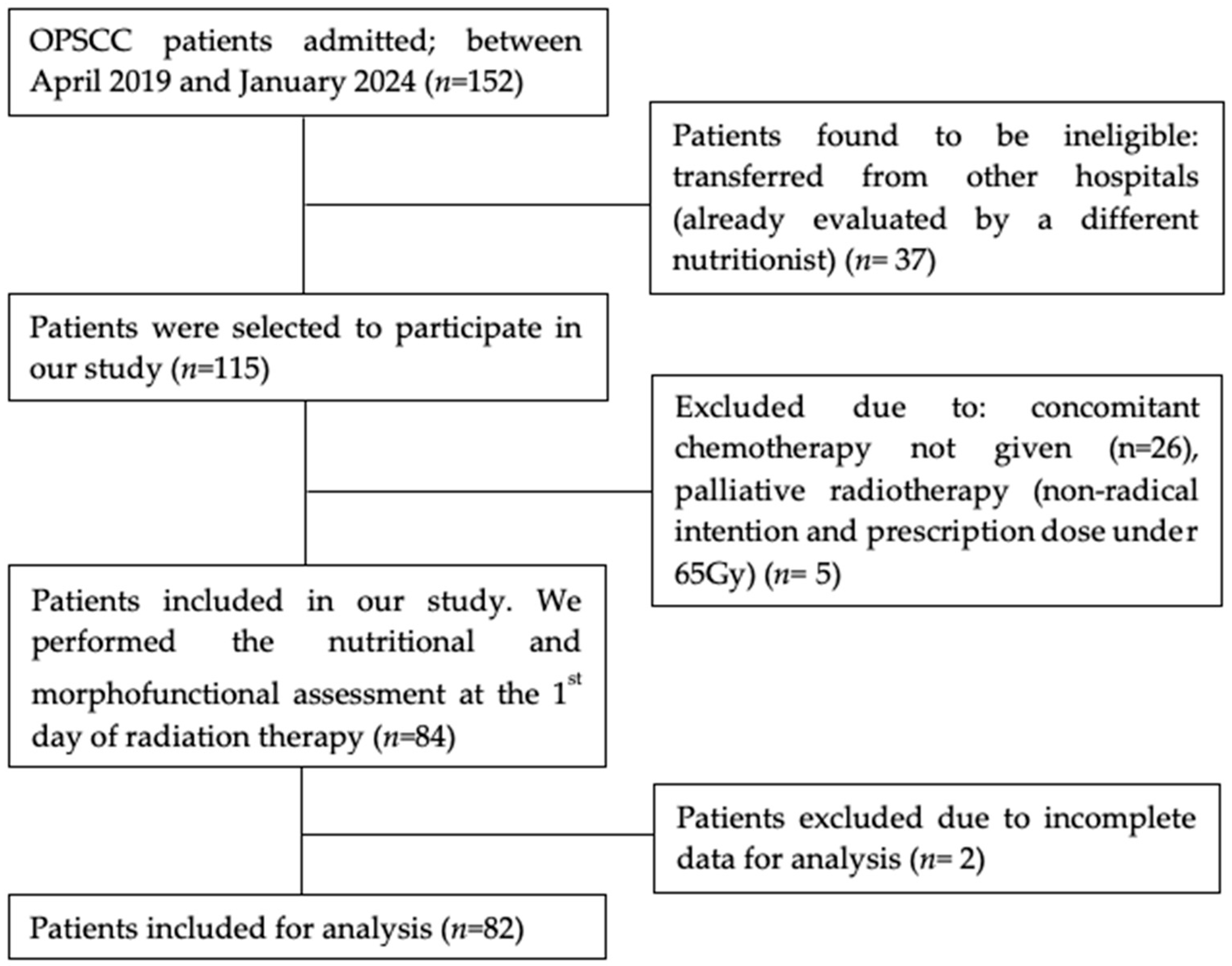 APA StyleFernández-Forné, Á., Fernández-Jiménez, R., Toledo-Serrano, M. D., Jiménez-Rodríguez, H., Muñoz-Lupiáñez, M., Ruiz-López, M. A., García-Almeida, J. M., De la Peña-Fernández, L., Queipo-Ortuño, M. I., & Gómez-Millán, J. (2025). Impact of Nutritional Status on Severe Radiation-Induced Mucositis in Oropharyngeal Cancer Patients Undergoing Chemo-Radiotherapy. Nutrients, 17(20), 3301. https://doi.org/10.3390/nu17203301