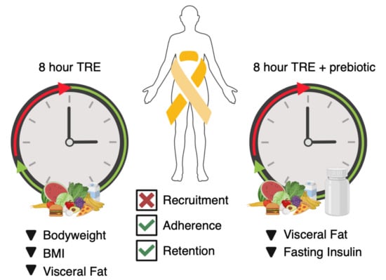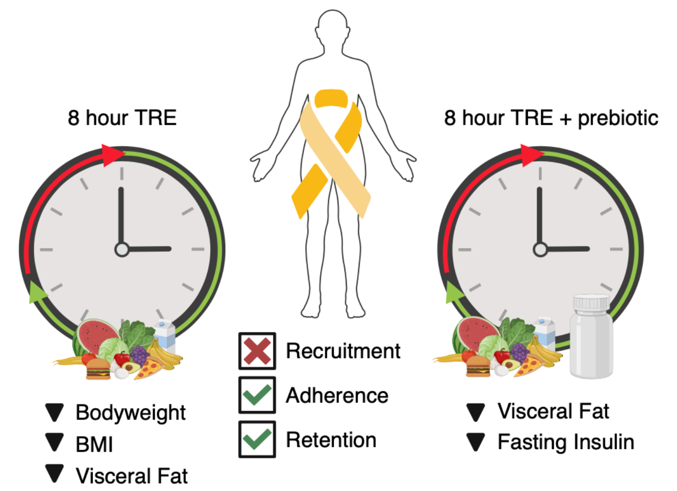 62]. However, we did not see an additional weight loss benefit of the prebiotic when added to TRE, although this could be due to our limited sample size. While there are no other trials combining TRE with a prebiotic, Iversen et al. combined daily calorie restriction with a prebiotic (high-fiber rye wheat) and found no additional weight loss benefit with the addition of the prebiotic [