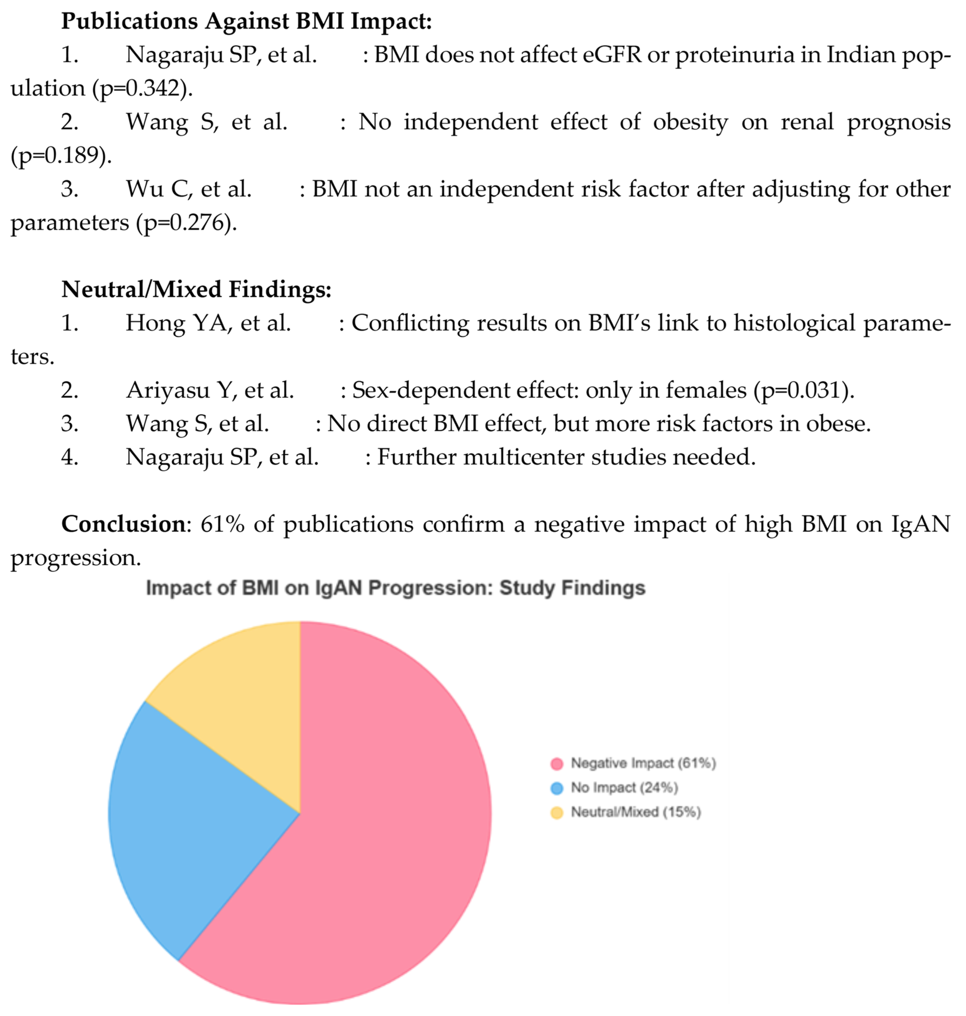 - Wang, Q.; Zhang, J.J.; Dou, W.J.; Yang, X.; Xu, J.; Zhao, Y.; Zhang, J.; Wang, H. Effect of body mass index on the prognosis of primary immunoglobulin A nephropathy: A systematic review and meta-analysis. Int. Urol. Nephrol. 2022, 54, 1067–1078. [Google Scholar] [CrossRef] [PubMed]