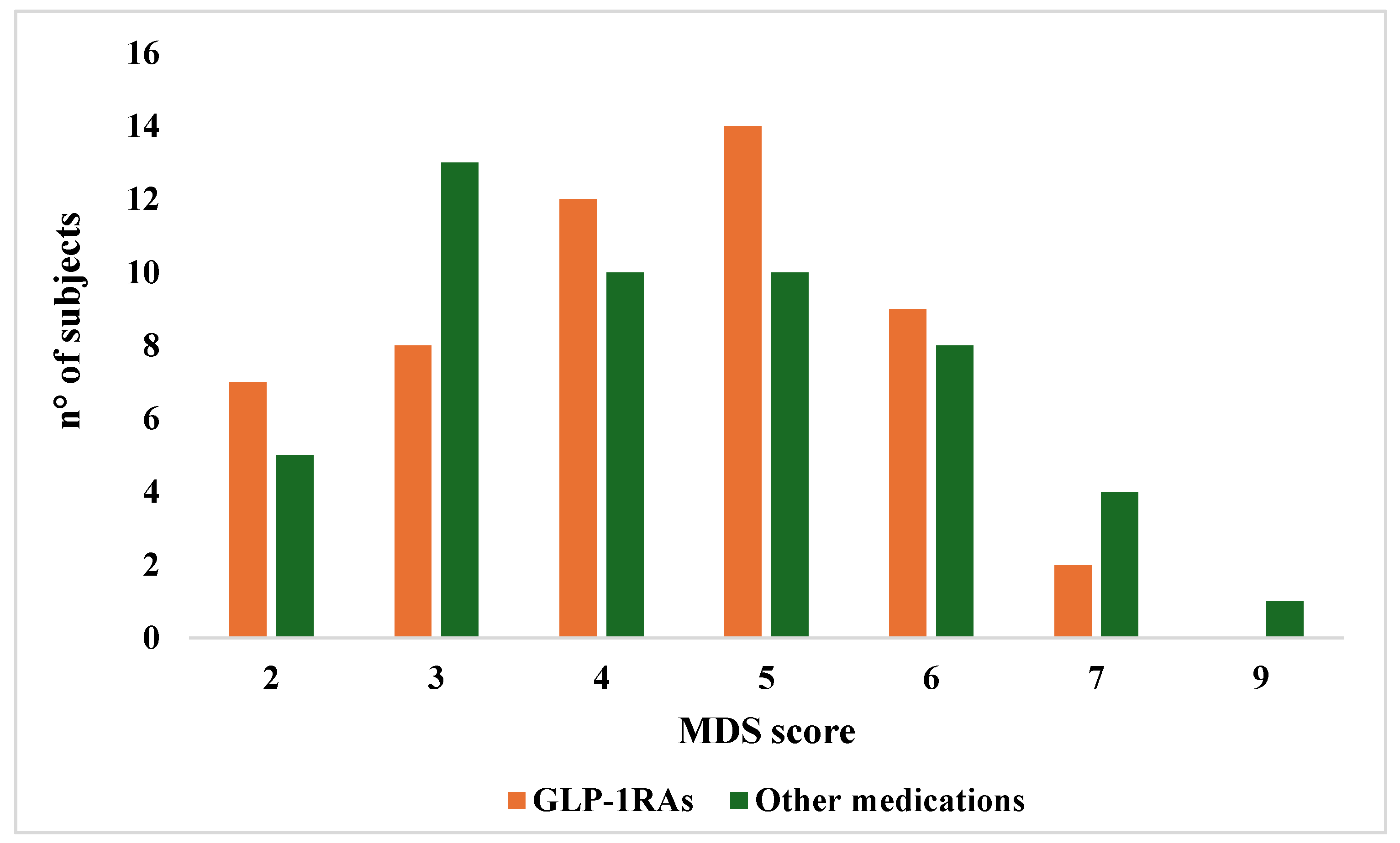 3.1. Comparison of Nutrient Intake and Adherence to the Mediterranean Diet Score Between Patients Taking GLP-1RAs Versus Those Under Other Medications