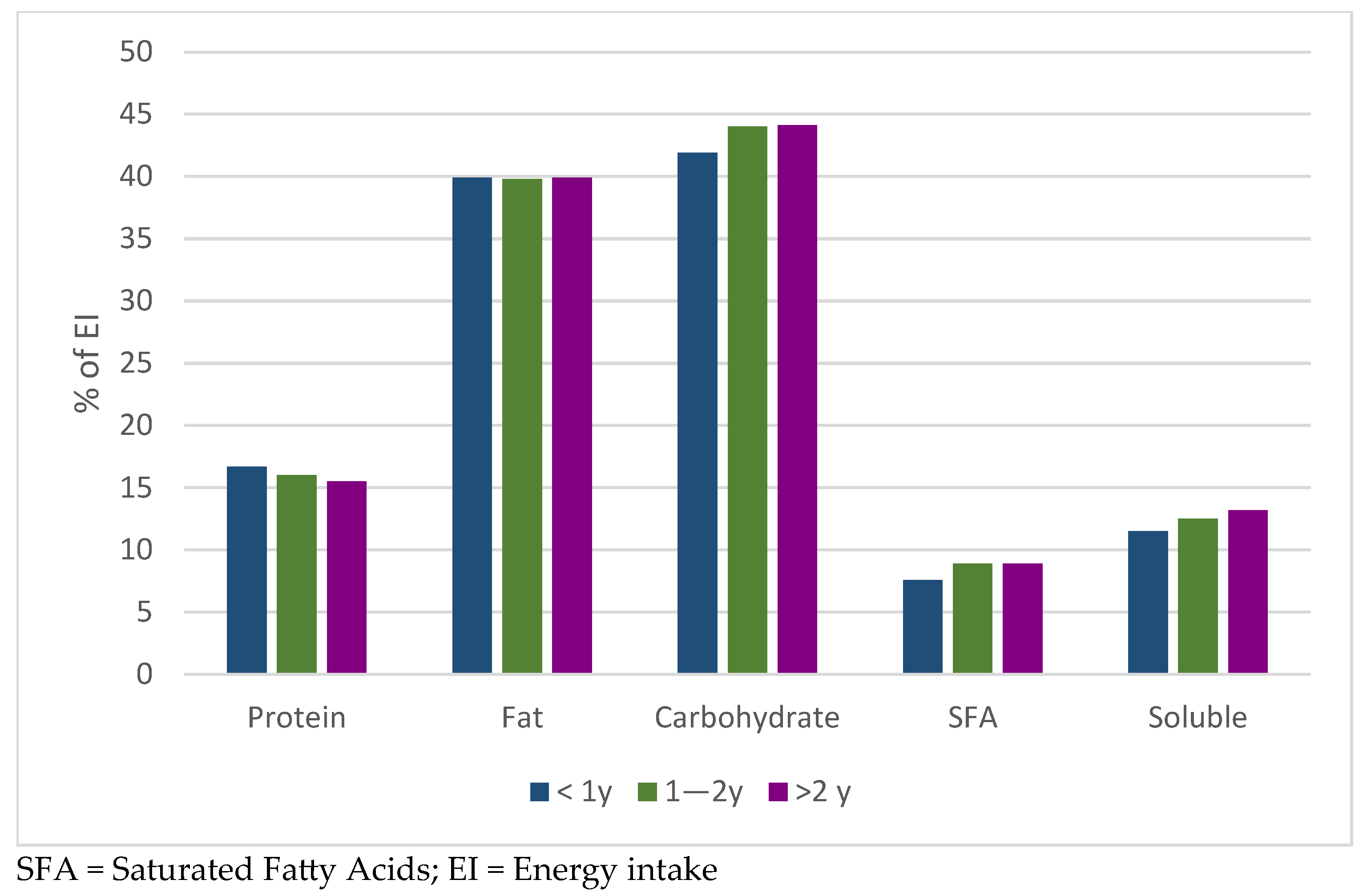 | Fat, g | 20–35% EI | 67.3 ± 20.5 | 40% | 67.9 ± 18.2 | 39% |