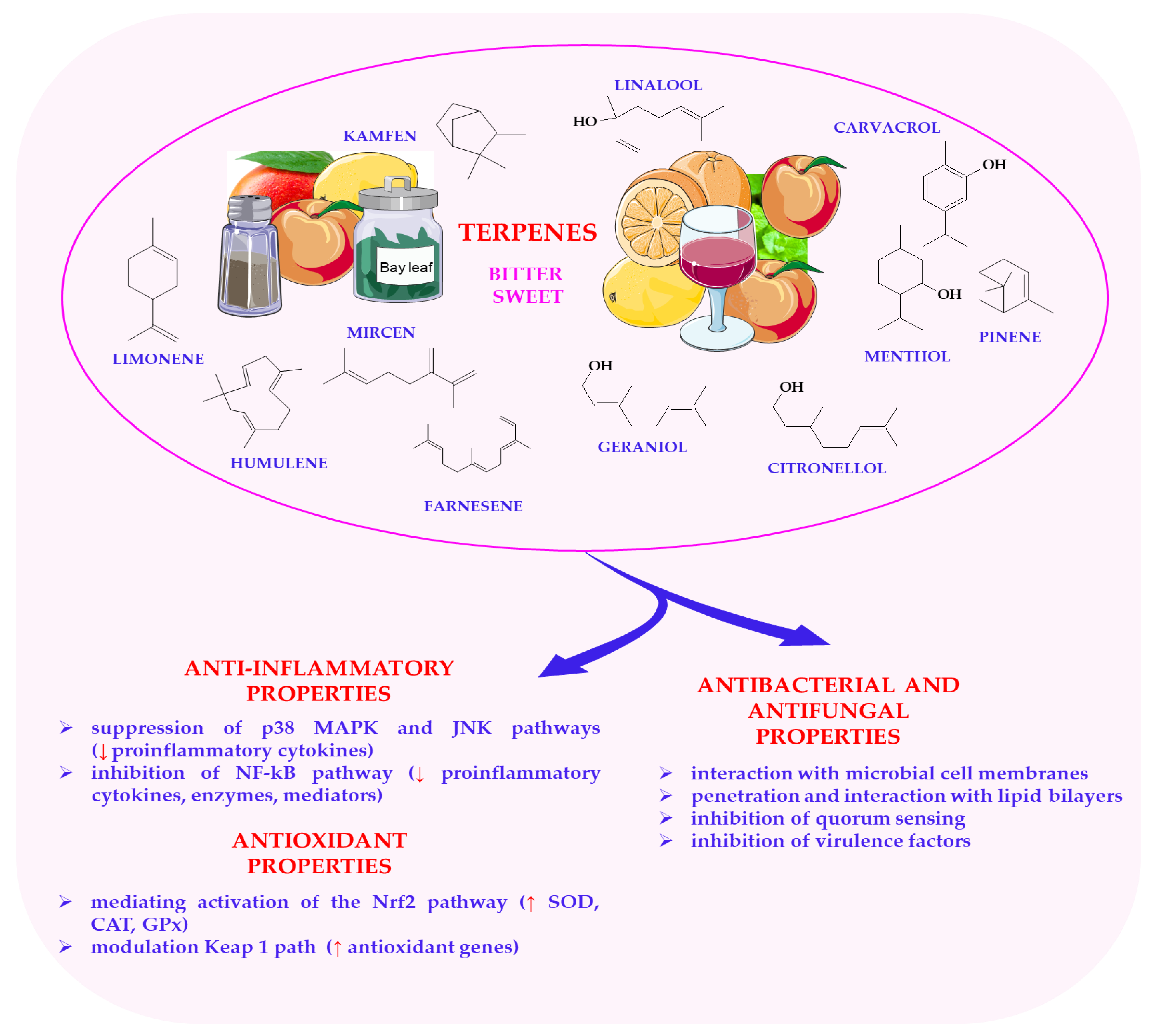 The release of volatile terpenes, such as β-caryophyllene and linalool, during food processing (e.g., heating, crushing, or fermentation) further alters the aroma profile of foods, introducing fresh, floral, citrus, or spicy notes that directly affect the overall flavour experience [167]. Terpenes also exhibit synergistic interactions with other bioactive compounds, including flavonoids, phenolics, and lipids, which can enhance or modify flavour perception [20,21]. It is important to note that each terpene has a different odour threshold, with certain compounds, such as limonene and pinene, having very low thresholds, meaning even small amounts can significantly affect the aroma and flavour of plant-based foods [168]. The molecular mechanisms by which terpenes exert their antioxidant, anti-inflammatory, and antimicrobial properties are shown in Figure 4. This figure shows that terpenes act through various mechanisms, including the modulation of signalling pathways, the activation of detoxifying enzymes and the regulation of gene expression related to inflammation and oxidative stress. Their antioxidant properties stem from the ability to scavenge free radicals, helping to protect cells from oxidative damage. Terpenes also exhibit anti-inflammatory effects by inhibiting the production of pro-inflammatory cytokines and modulating transcription factors such as NF-κB. Additionally, many terpenes have antimicrobial activity, affecting microbial cell membranes and disrupting their metabolic processes.