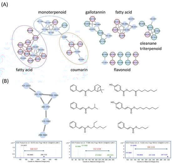 The GNPS molecular network highlighted six noteworthy clusters, including coumarins, gallotannins, monoterpenoids, fatty acids, triterpenoids, and flavonoids. In the triterpenoid cluster, four compounds were annotated using the GNPS platform against the online GNPS database, namely, betulonic acid, sumaresinolic acid, ursolic acid, and oleanolic acid. The largest cluster displayed the presence of numerous compound classes, including monoterpenoids such as (−)-carveol (m/z: 135.1170) and α-pinene (m/z: 137.1320), along with coumarins and fatty acids.