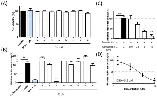 Effect of compounds on inhibition of the p16INK4A promoter activity. (A) Cell viability of compounds 1–8 from L. formosana was measured using an MTT assay. Cell viability results are expressed as relative values compared with the untreated group (set at 100%). Bar colors indicate groups: black, control; blue, navitoclax treated control; white, experimental. (B) Inhibitory effects of compounds 1–8 on p16INK4A promoter activity. Bar colors indicate groups as in panel (A). (C,D) Inhibitory effect of compound 3 in a dose-dependent manner (1.25, 2.5, 5, and 10 µM). (C) Compound 3 reduced p16INK4A promoter activity (black, control; white, treated. (D) Dose–response curve of compound 3 based on data from panel (C). Data were normalized to β-galactosidase activity and are presented as mean ± SEM (n = 3). Statistical analysis was performed using one-way ANOVA followed by Dunn’s multiple comparisons test (* p < 0.05, *** p < 0.001 vs. control; ## p < 0.01, ### p < 0.001 vs. no transfection control).
