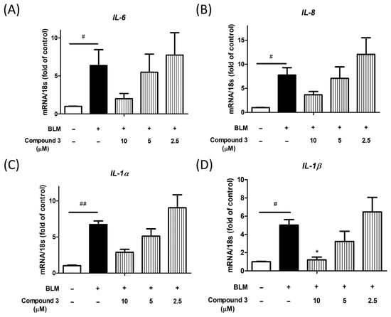 SASP, or senescence-messaging secretome (SMS), includes cytokines such as IL-6, IL-8, IL-1α, and IL-1β, which are characteristic features of senescent cells [29]. These cytokines not only serve as biomarkers but also play functional roles in reinforcing the senescent state and affecting surrounding tissues. For instance, interleukin-6 (IL-6) can induce premature senescence through activation of signal transducer and activator of transcription 3 (STAT3) signaling [30]. IL-8 is similarly overexpressed in senescent fibroblasts via autocrine signaling through the IL-8 pathway [31]. Besides IL-6 and IL-8, IL-1 family members, including membrane-bound IL-1α and soluble IL-1β, have also been studied as markers of senescence. Given this, we employed the bleomycin-induced senescence model in IMR90 fibroblasts, a well-established system for cellular aging studies, which leads to changes in the mRNA levels of SASP factors [32,33,34]. In this experiment, senescence was induced in IMR90 fibroblasts by a 2-day bleomycin pretreatment, followed by exposure to compound 3 for 48 h. The expression of four major SASP-associated genes (IL-6, IL-8, IL-1α, and IL-1β) was reduced in a dose-dependent manner upon treatment with compound 3 (Figure 5). At 10 µM, compound 3 markedly suppressed the expression of all four cytokines compared with the bleomycin-only control, with reductions of 68.55% for IL-6, 52.75% for IL-8, 57.18% for IL-1α, and 75.83% for IL-1β. At 5 µM, partial reductions were observed for IL-1α and IL-1β, whereas IL-6 and IL-8 remained largely unchanged. In contrast, treatment with 2.5 µM compound 3 did not produce significant effects on any of the tested markers. These findings indicate that compound 3 exerts the most robust and consistent inhibitory effects on SASP gene expression at 10 µM.