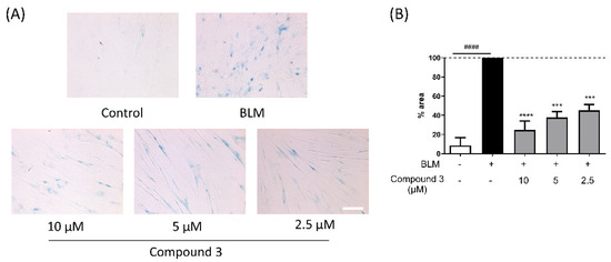 Results of the senescence-associated β-galactosidase (SA-β-gal) staining (A) and quantification. Bar shading denotes the following groups: white (control), black (bleomycin-only control), and gray (experimental). (B). IMR90 cells were exposed to bleomycin (BLM, 40 µg/mL) for 2 days and subsequently treated with the indicated compounds for an additional 2 days. Cells were then analyzed by SA-β-gal staining. Compound 3 was tested in a dose-dependent manner (2.5, 5, and 10 µM). The proportion of SA-β-gal-positive cells was significantly reduced in the compound 3-treated groups compared with the bleomycin-only control. Data are presented as mean ± SEM (n = 3). Statistical analysis was determined using one-way ANOVA followed by Dunn’s multiple comparisons test (*** p < 0.001, **** p < 0.0001 vs. 2-day BLM-treated group; #### p < 0.0001 vs. control). Scale bars = 200 µm.