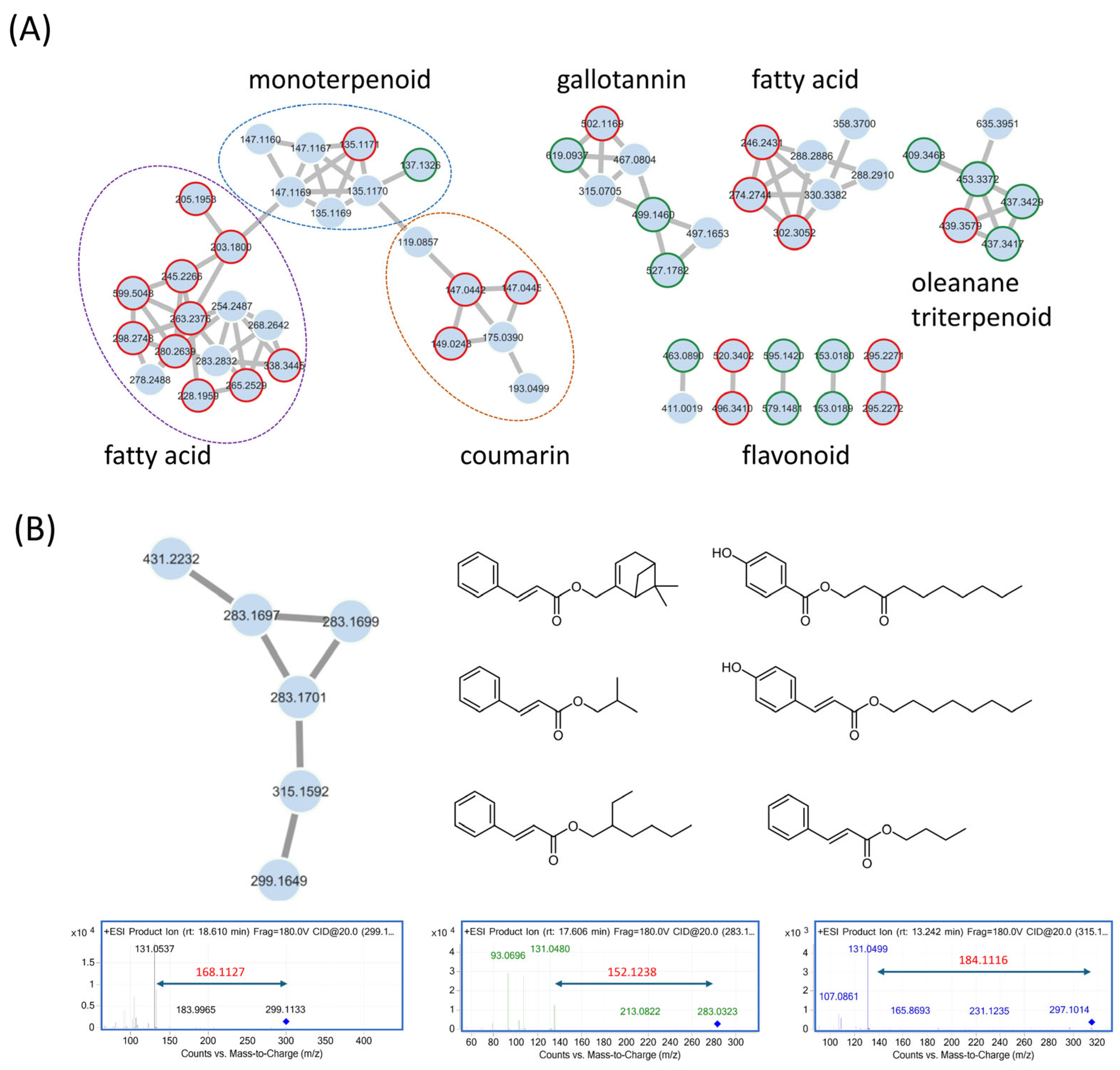Figure 1. (A) Clusters of interest from molecular networking of the crude extract from the roots of L. formosana using UPLC qTOF-MS/MS data acquired in the positive mode. Nodes were grouped into chemical classes, and clusters were circled as follows: blue for monoterpenoids, purple for fatty acids, and orange for coumarins. Individual nodes annotated by GNPS are highlighted with a red ring, while nodes putatively identified from the literature (via a Reaxys search for compounds previously reported from L. formosana) are marked with a green ring. (B) The target cluster for isolation (left) and suggested structures for cluster (right), as revealed by SNAP-MS and tandem MS analyses, show cinnamic acid derivatives bearing possible monoterpene moieties.