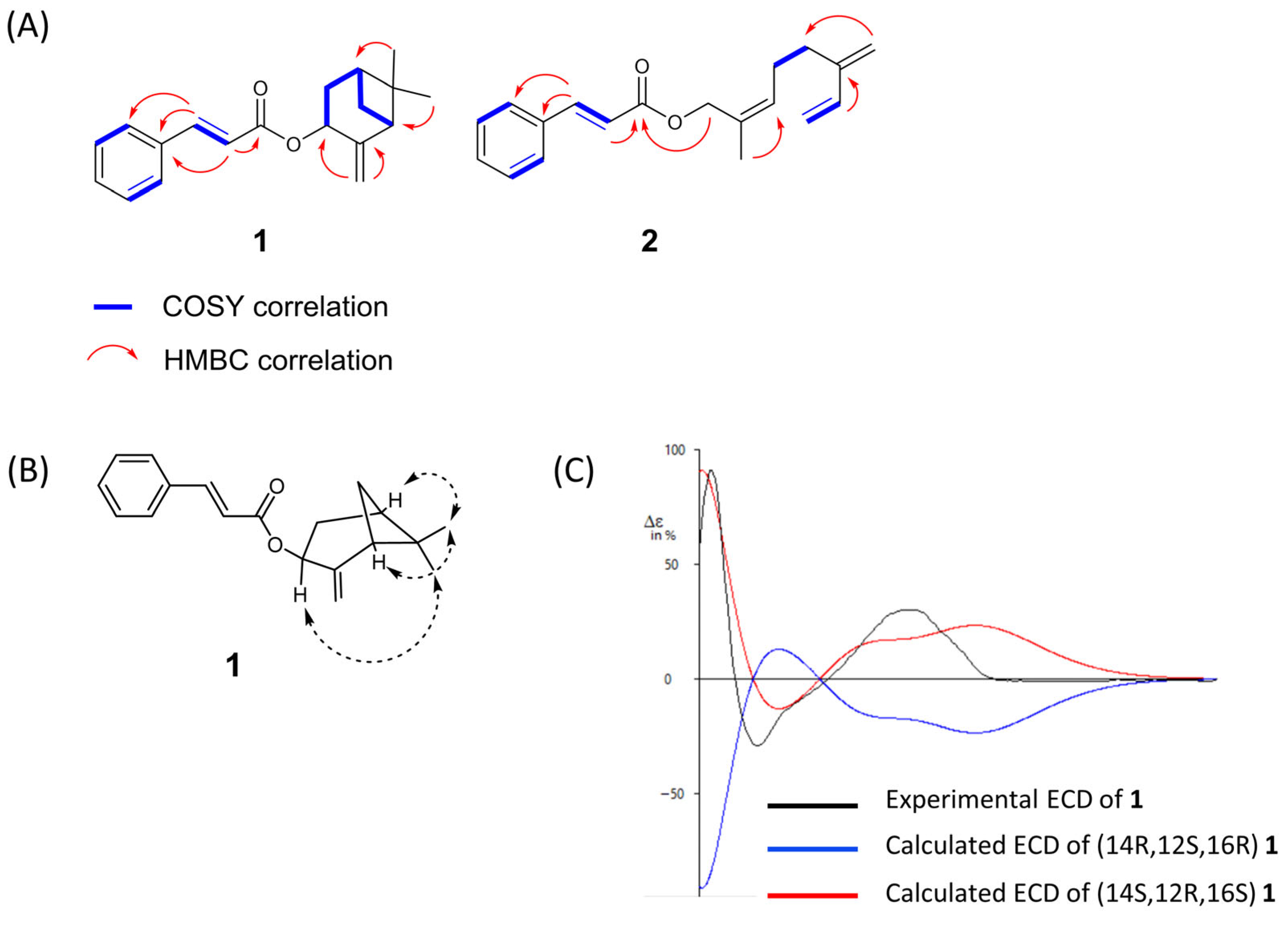 The structure of compound 1 was deduced using 1H and 13C NMR, one- and two-dimensional spectroscopy, as well as IR and MS analyses (Figure 2). UPLC qTOF-MS/MS analysis of 1 yielded a protonated molecular ion [M + H]+ at m/z 283.1710 (calcd for C19H23O2, 283.1693), consistent with a molecular formula of C19H22O2, indicating nine degrees of unsaturation. The 1H NMR spectrum exhibited characteristic signals of a trans-disubstituted double bond at δH 7.68 and 6.45 (each d, J = 16.0 Hz), an oxygenated methine at δH 5.70, two protons of an exomethylene group (δH 5.11, 4.93), and a vinyl methyl group at δH 0.73 and 1.31 (each s). The 13C NMR data, in conjunction with DEPT experiments, revealed 19 resonances attributable to one carbonyl (δC 166.7), six aromatic carbons (δC 128.2, 128.2, 129.0, 129.0, 130.3, 134.6), four olefinic carbons (δC 144.6, 119.04, 150.5, 114.4), two quaternary sp3 carbons (δC 40.7, 150.5), two methylenes (δC 28.1, 33.5) including one exomethylene (δC 114.4), and two methyl carbons (δC 22.1, 26.0). COSY, HSQC, and HMBC spectral data provided additional evidence to confirm the structure of compound 1. The COSY spectrum of compound 1 displayed connectivities between H-16 (δH 2.02, m) and H-17 (δH 1.88, 2.45, each m), H-16 and H-19 (δH 1.58, 1.69, each m), H-19 and H-14 (δH 2.56, t, J = 5.4 Hz), and H-17 and H-12 (δH 5.70, d, J = 8.0 Hz) (Figure 3A). The HMBC spectrum of compound 1 showed significant correlations from the exomethylene protons (δH 4.93, 5.11, each br s, H-18) to C-13 (δC 150.5), C-12 (δC 68.8), and C-14 (δC 50.9). The signals for H-19 correlated with C-13, C-14, C-15 (δC 40.7), C-16 (δC 39.7), and C-17 (δC 33.5), whereas H-20 (δH 0.73) and H-21 (δH 1.31) showed correlations with C-15 and C-21 (δC 26.0). In addition, the correlations of H-7 (δH 7.68, d, J = 16.0 Hz) with C-5 (δC 134.6), C-6 (δC 128.2), and C-4 (δC 128.2), as well as the correlation of H-8 (δH 6.45, d, J = 16.0 Hz) with C-5, supported the proposed structure as a cinnamic acid conjugated with β-pinene. The relative configuration of 1 was determined based on diagnostic NOE correlations (Figure 3B). NOE correlations between Me-20 and H-14, and between Me-20 and H-16, revealed an α-orientation, whereas the NOE correlation between Me-21 and H-12 indicated a β-orientation. Based on the relative configuration, the absolute configuration of 1 was assigned as 14S,12R,16S by ECD calculations (Figure 3C). Therefore, compound 1 was characterized as β-pinenyl cinnamate.