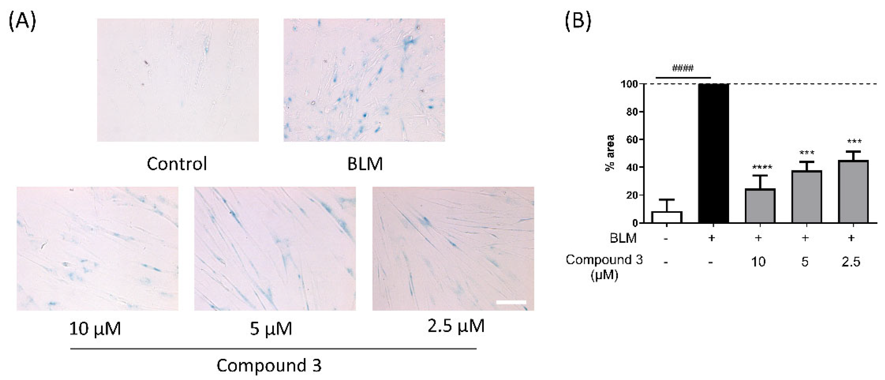 Figure 6. Results of the senescence-associated β-galactosidase (SA-β-gal) staining (A) and quantification. Bar shading denotes the following groups: white (control), black (bleomycin-only control), and gray (experimental). (B). IMR90 cells were exposed to bleomycin (BLM, 40 µg/mL) for 2 days and subsequently treated with the indicated compounds for an additional 2 days. Cells were then analyzed by SA-β-gal staining. Compound 3 was tested in a dose-dependent manner (2.5, 5, and 10 µM). The proportion of SA-β-gal-positive cells was significantly reduced in the compound 3-treated groups compared with the bleomycin-only control. Data are presented as mean ± SEM (n = 3). Statistical analysis was determined using one-way ANOVA followed by Dunn’s multiple comparisons test (*** p < 0.001, **** p < 0.0001 vs. 2-day BLM-treated group; #### p < 0.0001 vs. control). Scale bars = 200 µm.