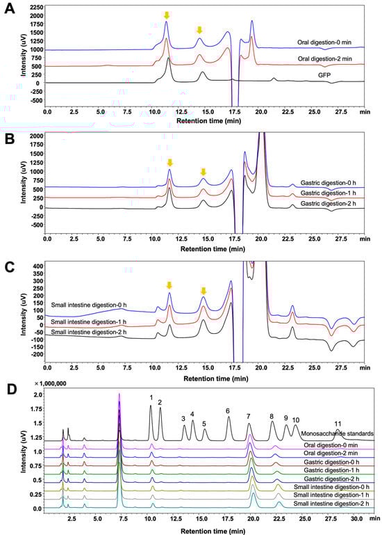 Changes in the molecular weight distribution and monosaccharide composition of Grifola frondosa polysaccharides (GFPs) during the in vitro simulated digestion. The molecular weight distribution of GFPs during simulated oral digestion (A), gastric digestion (B), and small intestinal digestion (C). The chromatographic peaks of GFPs are marked with yellow arrows. (D) Monosaccharide composition of GFPs across different simulated digestion stages (oral: 0 min, 2 min; gastric: 0 h, 1 h, 2 h; small intestinal: 0 h, 1 h, 2 h). Peaks corresponded to the following monosaccharides: 1−Man, 2−GlcN, 3−Rha, 4−GlcA, 5−GalA, 6−GalN, 7−Glc, 8−Gal, 9−Xyl, 10−Ara, 11−Fuc.