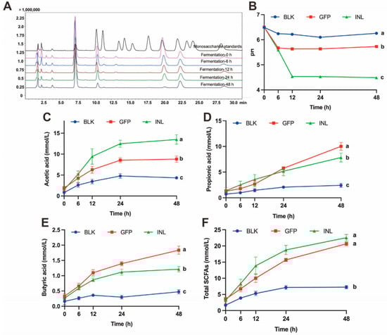 Dynamic changes in the fermentation broth properties during the in vitro fermentation of GFPs. (A) Changes in the monosaccharide composition of GFPs at different fermentation time points (0 h, 6 h, 12 h, 24 h, 48 h, peaks corresponded to the following monosaccharides: 1−Man, 2−GlcN, 3−Rha, 4−GlcA, 5−GalA, 6−GalN, 7−Glc, 8−Gal, 9−Xyl, 10−Ara, 11−Fuc). (B) Changes in the pH value of the fermentation broth across three groups [blank control (BLK), GFPs, positive control (INL, inulin-supplemented)] at different fermentation time points (0 h, 6 h, 12 h, 24 h, 48 h). pH was measured at 0, 6, 12, 24, 48, and 72 h using an SD20 pH meter (Mettler-Toledo, accuracy: ±0.01 pH unit), with 3 technical replicates per group. Changes in acetic acid (C), propionic acid (D), butyric acid (E), and total SCFA (F) content of the fermentation broth across the BLK, GFP, and INL groups at different fermentation time points (0 h, 6 h, 12 h, 24 h, 48 h). Short-chain fatty acids (SCFAs) were detected via gas chromatography-mass spectrometry (GC-MS, Thermo TRACE 1310−ISQ QD) using an SH-Rtx-WAX column (30 m × 0.25 mm × 0.25 μm). The letters a, b, c indicate significant differences, meaning values labeled with different letters are significantly distinct from each other.