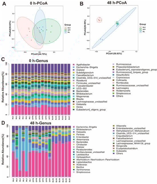 Principal coordinate analysis (PCoA) based on UniFrac distances revealed minimal intergroup differences at 0 h, with PCoA1 and PCoA2 explaining 44.75% and 30.02% of the total variance, respectively (Figure 4A). In contrast, at 48 h, PCoA1 and PCoA2 contributed for 50.83% and 29.59% of the variance, respectively (Figure 4B), indicating a significant shift in the microbial community structure. The increased distance between the GFP and BLK groups, along with the reduced distance between the GFP and INL groups, reflects distinct microbial community differentiation between GFPs and BLK, while GFPs and INL exhibited more similar community structures.