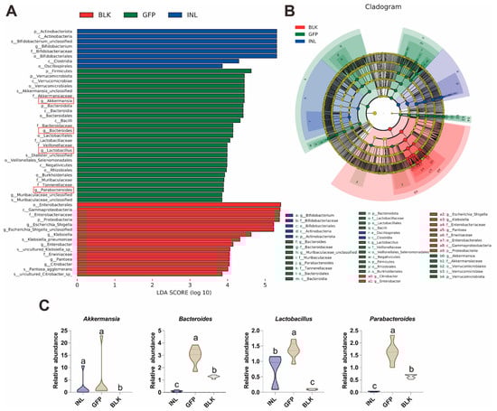 To identify the dominant GM taxa in each group, we used linear discriminant analysis effect size (LEfSe) to detect taxonomically distinct taxa that differed significantly between groups. Here, we focused on taxa with a linear discriminant analysis (LDA) score > 3.5 (Figure 5A,B). The relative abundance of Proteobacteria (particularly the Escherichia-Shigella, Klebsiella, and Enterobacter) was significantly increased in the BLK group (Figure S3). In contrast, compared with the BLK and INL groups, the GFP group showed a significant enrichment of Akkermansia, Bacteroides, Lactobacillus, and Parabacteroides (Figure 5C), which is consistent with the results of the relative abundance analysis. These four genera are widely recognized as probiotics in the human intestine [,,]. These findings suggest that GFPs can modulate the structure and composition of GM by increasing the relative abundance of specific beneficial bacteria.