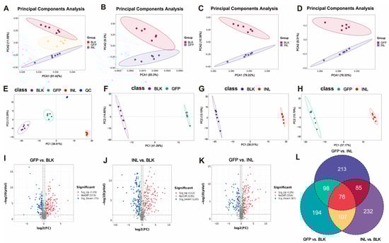 Principal component analysis (PCA) was used to assess metabolite diversity. The results showed clear separation among the three experimental groups (Figure 6A). Pairwise PCA analyses further revealed distinct separation of the GFP group from the BLK and INL groups (Figure 6B–D). Subsequently, partial least squares discriminant analysis (PLS-DA) was applied to evaluate the metabolic differences between groups (Figure 6E–H). The PLS-DA score plot showed distinct clustering of the compared groups. Furthermore, permutation tests indicated that all models had R2 > 0.5 and negative Q2 values (Figure S4), indicating that none of the models were overfitted and that they could reliably capture the metabolic differences between groups.