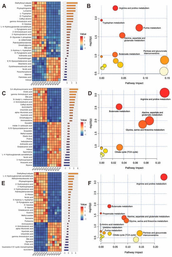 Comparative analysis of significantly differential metabolite profiles induced by GFPs. (A) Heatmap and bubble plot of the top 30 differential metabolites between the GFP and BLK groups. (B) Enriched metabolic pathways for the top 30 metabolites (GFPs vs. BLK) based on KEGG. (C) Heatmap and bubble plot of the top 30 metabolites between the BLK and INL groups. (D) Enriched pathways for the top 30 metabolites (INL vs. BLK) based on KEGG. (E) Heatmap and bubble plot of the top 30 metabolites between the GFP and INL groups. (F) Enriched pathways for the top 30 metabolites (GFP vs. INL) based on KEGG. Heatmaps use red for higher and blue for lower relative abundance. Pathway plots use darker colors to indicate a greater number of enriched pathways.