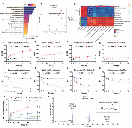 To further identify the beneficial gut microbiota and their metabolites affected by GFPs, we first ranked the KEGG-enriched differential metabolic pathways (GFPs vs. BLK) by p-value. The results showed that arginine and proline metabolism, tryptophan metabolism, and purine metabolism were the top three differential pathways modulated by GFPs (Figure 8A). Using the thresholds of p < 0.05 and |log2FC| > 1, we plotted a volcano plot for the seven differential metabolites enriched in these pathways (Figure 8B, Table S6). Among these metabolites, γ-aminobutyric acid (GABA) was the most significant differential one. GABA is a well-recognized amino acid with multiple biological activities. We further conducted Spearman correlation analysis on ten key bacterial taxa, seven key metabolites, and four fermentation markers identified in the BLK and GFPs groups. As shown in Figure 8C, Bacteroides, Lactobacillus, and Parabacteroides exhibited a significant positive correlation with GABA, while Akkermansia showed a positive but non-significant correlation. Based on microbiome profiling and correlation analysis, we selected four representative commercial strains (Bacteroides thetaiotaomicron, Lactobacillus plantarum, Parabacteroides distasonis, and Akkermansia muciniphila) to verify whether GFPs could enhance microbial GABA production [,,,].