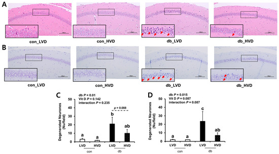 To ascertain whether db/db pathology and dietary vitamin D levels induced morphological alterations in hippocampal neurons within the CA1 region, brain sections were examined using H&E (Figure 1A,C) and Nissl (Figure 1B,D) staining. Both staining methods revealed a higher number of apoptotic neurons in the db/db mice compared with those in the control mice (p < 0.05). In particular, histological analysis demonstrated pronounced neuronal cell death in the CA1 region of the db_LVD group, evidenced by numerous red arrows marking apoptotic neurons (Figure 1A). In contrast, the db_HVD group exhibited a lower density of apoptotic neurons (Figure 1B). Quantitative analysis of Nissl-stained sections indicated that the number of apoptotic neurons in the db_LVD group (23.5 ± 11.5) was 3.4-fold higher than in the db_HVD group (7.0 ± 3.0; p < 0.05; Figure 1D). Similarly, H&E staining indicated a 2.1-fold greater tendency of apoptotic neurons in the db_LVD group (21 ± 8.0) than in the db_HVD group (10 ± 4.5) (p = 0.088; Figure 1C). These results indicate that hippocampal neurons in db/db mice may be susceptible to diabetes-induced damage, and that high dietary vitamin D level could potentially mitigate this neurodegeneration.