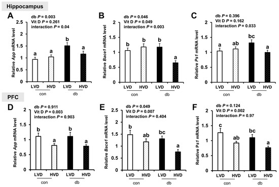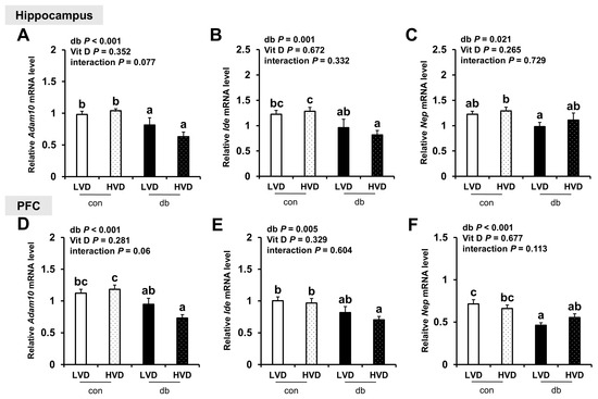 Regarding the expression of Aβ degradation-related genes (Adam10, Ide, and Nep), their levels were generally lower in the hippocampus and PFC of db/db mice (two-way ANOVA, p < 0.05); however, dietary vitamin D levels did not markedly affect their expression in either control or diabetic mice (Figure 3A–F).