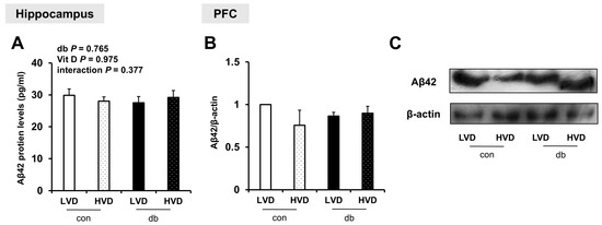 To examine whether Aβ protein was accumulated in the hippocampus and PFC, and whether its levels were affected by diabetes and dietary vitamin D levels, Aβ42 protein levels were measured. Despite the upregulation of amyloidogenic genes in db/db mice and their suppression by high dietary vitamin D level, Aβ42 protein levels were not significantly affected by either diabetes or dietary vitamin D levels in the hippocampus or PFC (Figure 4A–C and Figure S2).