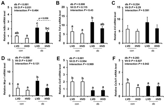 mRNA Expression Levels of Inflammatory Markers in the Hippocampus. The relative mRNA expression levels of IκBα, Tnf-α, Il-6, Mcp-1, Ccl5, and Cx3cl1 in the hippocampus (A–F) were measured using RT-PCR. Data are presented as mean values ± SEMs (n = 10 for con_LVD and con_HVD; n = 7 for db_LVD and db_HVD). p-values from two-way ANOVA are shown in the upper left corner of the graph to indicate the effects of diabetes, vitamin D levels, and their interaction. Different superscript letters (a, b) represent significant group differences (p < 0.05), and p-value on the dashed line indicate difference between two groups, as determined by Fisher’s LSD multiple-comparison test.
