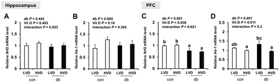 To further assess oxidative stress, we evaluated the mRNA expression levels of antioxidant response-related genes (Nrf2 and Ho-1). In diabetic mice, Nrf2 expression was significantly reduced in the PFC (two-way ANOVA, p < 0.05), whereas hippocampal Nrf2 and Ho-1 in both the hippocampus and PFC were not affected by diabetes. Overall, dietary vitamin D did not exert a significant effect on Nrf expression; however, among db/db mice, Ho-1 expression in the PFC was significantly lower in db_HVD mice compared with in db_LVD mice (Figure 7, p < 0.05).