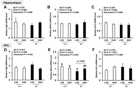 Considering the reduction in neuronal cell death in db_HVD group (Figure 1), we investigated its potential effects on neurotrophic factor expression (Ngf, Bdnf, and Nt-3; Figure 9. Among these, only PFC Bdnf, which was significantly lower in db/db mice (db_LVD), showed a tendency toward higher levels with a high dietary vitamin D level, but the change was not statistically significant (db_HVD, p = 0.068; Figure 9E). Ngf and Nt-3 expression remained unchanged in both the hippocampus and PFC.