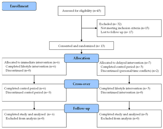 Study accrual and retention are outlined in Figure 1. Forty-five women completed the screening survey and were contacted for follow-up. Fifteen did not meet the inclusion criteria, and seventeen were lost to follow-up. Thirteen participants completed written informed consent, and six were allocated to the immediate intervention group. Of the seven in the delayed intervention group, two withdrew consent prior to the 8-week crossover. Thus, eleven participants completed both intervention and control periods. No adverse events were reported during the study, and the two participant withdrawals were due to personal and scheduling conflicts rather than study-related issues.