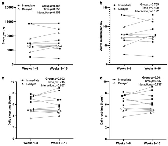 Individual actigraphy measures in immediate and delayed groups: (a) steps, (b) active minutes, (c) sleep, and (d) rest across study phases (weeks 1–8 and 9–16).