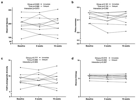 Alpha diversity metrics are displayed in Figure 6. No significant effects of group, time, or GxT were observed for Faith’s Phylogenetic Diversity (p = 0.90), Observed Species (p = 0.87), Shannon Entropy (p = 0.27), or Pielou’s Evenness (p = 0.28). Mean values for Faith’s PD were similar between the immediate (9.14 ± 1.22) and delayed (8.78 ± 1.22) groups (95% CI = −2.45 to 3.16), indicating stable within-sample diversity across the intervention.