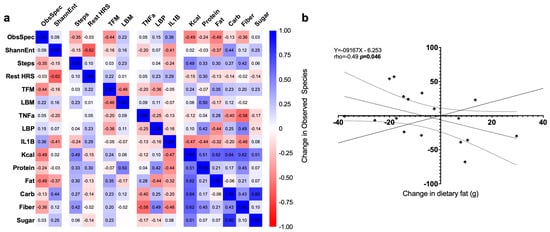 (a) Heatmap showing correlations among changes in study outcome variables; (b) Relationship between change in dietary fat intake and change in gut microbial richness (Observed Species). Each point represents an individual study period (i.e., one participant per intervention condition). The solid line represents the best-fit linear regression, with dotted lines indicating 95% confidence intervals.
