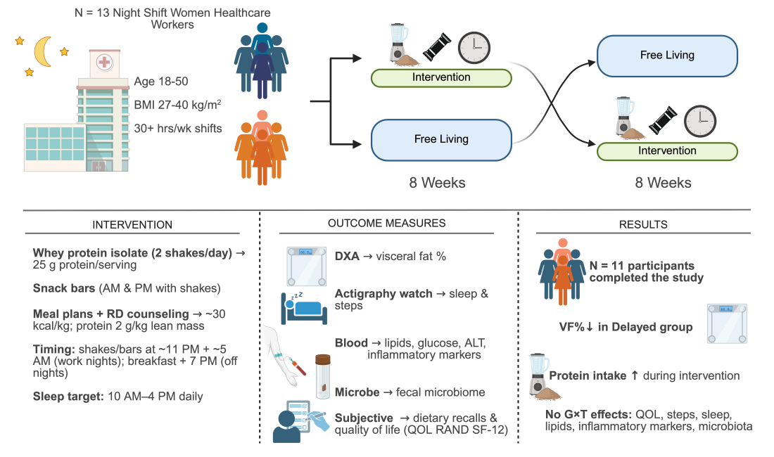Robinson LA, Lennon S, Pegel AR, Strickland KP, Feeley CA, Watts SO, J. Van Der Pol W, Roberts MD, Greene MW, Frugé AD. A Randomized Controlled Crossover Lifestyle Intervention to Improve Metabolic and Mental Health in Female Healthcare Night-Shift Workers. Nutrients. 2025; 17(21):3342. https://doi.org/10.3390/nu17213342