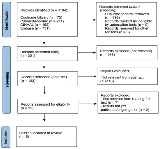 A comprehensive literature search was conducted up to June 2025. Major scientific databases, specifically PubMed-Medline, Embase, Cochrane Library, and CINAHL were searched. The search strategy included key terms such as “ketogenic diet,” “Parkinson’s disease,” and “quality of life,” along with relevant synonyms and related phrases. Mesh terms associated with keywords and free terms were also used both in PubMed and Cochrane Library databases to create search strings. Boolean operators (AND/OR) were carefully applied to relate Mesh terms, equivalent terms, and keywords, ensuring a broad yet targeted search. Once the search results were retrieved from each database, a selection process was carried out using Rayyan software (https://www.rayyan.ai/, Copyright © 2025 RAYYAN). The screening was conducted based on specific criteria. Initially, duplicates were identified and excluded. The remaining studies underwent an additional screening process to assess their alignment with the research question. The screening involved selection based on titles, followed by evaluation of the abstract and full-text content to determine relevance to the PICO framework and the inclusion/exclusion criteria established at the outset of this review (Supplementary File S1).
