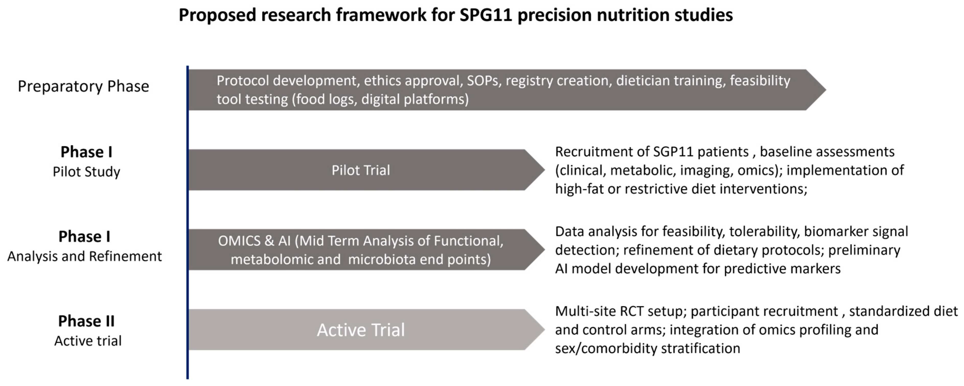 Figure 2 presents a proposed research roadmap for implementing precision nutrition in SPG11. The framework outlines sequential yet overlapping phases, from preparatory work to clinical application. The preparatory stage focuses on protocol design, ethics approval, registry establishment, and training of clinical teams. The pilot phase then evaluates the safety, feasibility, and adherence of tailored diets—such as ketogenic or calorie-restricted regimens—in a small SPG11 cohort. Next, integration of multi-omics and artificial-intelligence tools enables refinement of biomarkers and identification of metabolic targets. The active-trial phase expands these efforts through multicenter implementation and longitudinal monitoring of clinical, metabolic, and microbiota outcomes. Throughout all stages, ethical oversight, patient engagement, and data transparency are maintained to ensure safe and equitable translation into routine clinical practice.