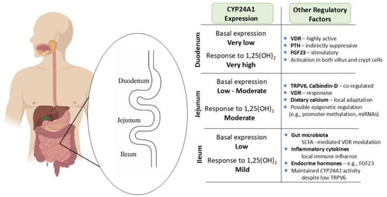 Although less prominent in the ileum, CYP24A1 remains functionally relevant, helping to regulate vitamin D levels where TRPV6 expression is reduced. Its activity in ileal epithelial cells is shaped by endocrine, microbial, and inflammatory cues, positioning this segment as a site of metabolic fine-tuning. Altogether, the segment-specific regulation of CYP24A1 enables the intestine to adaptively control vitamin D catabolism and maintain mineral and mucosal homeostasis [39,40] (Figure 2).